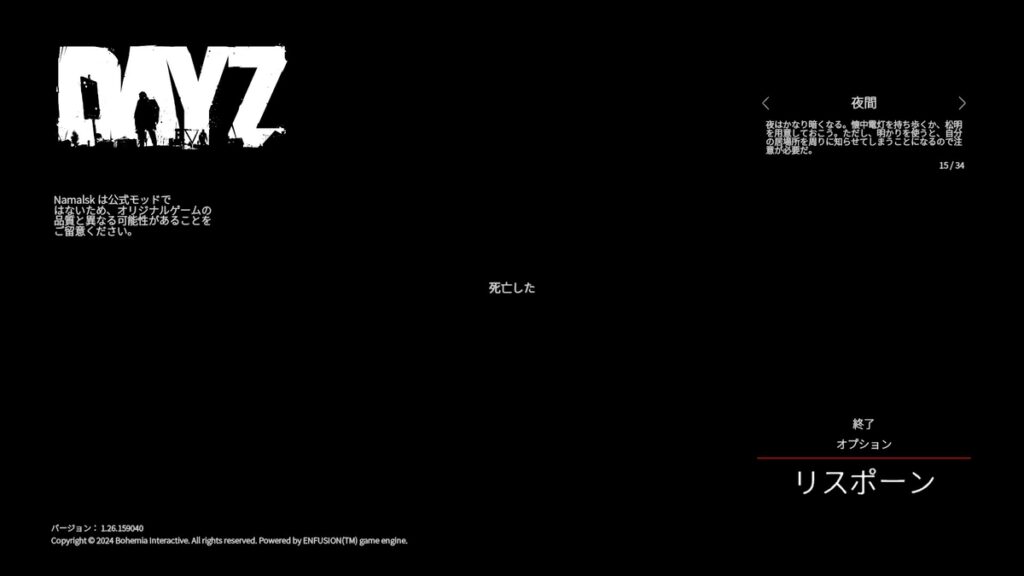 Namalskは、公式マップの Chernarus や Livonia と異なり、寒空の下にスポーンします。2024年10月15日にリリースされた Sakhal マップも同じく極寒の環境ですが、Namalskの場合は、さらに凍傷システムが導入されているため、より過酷なサバイバルを求められます。