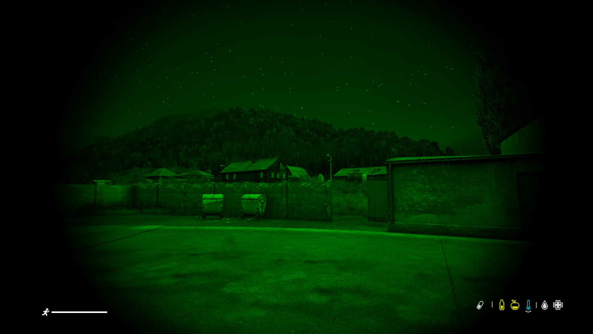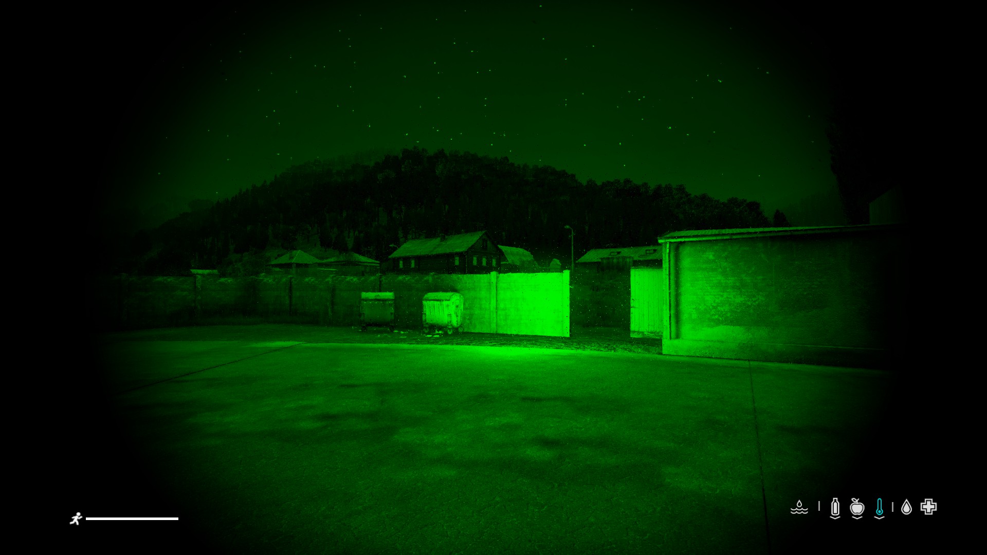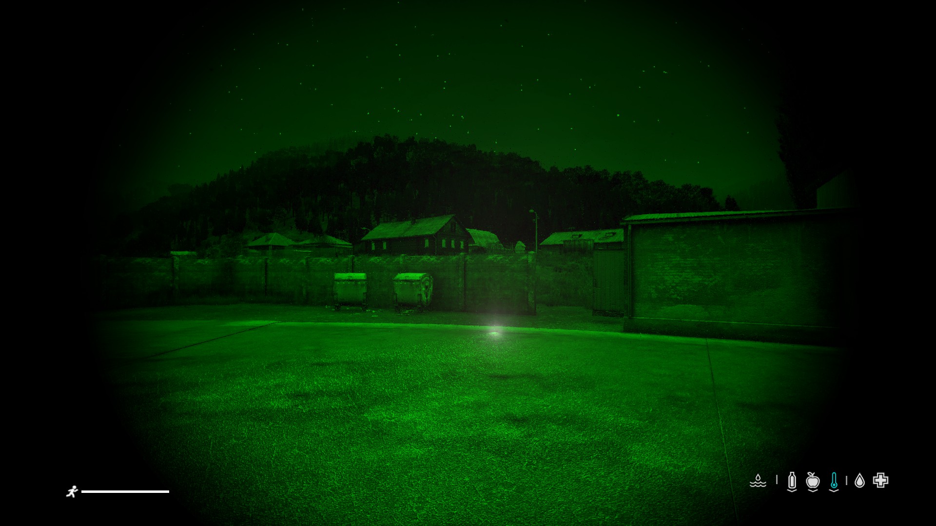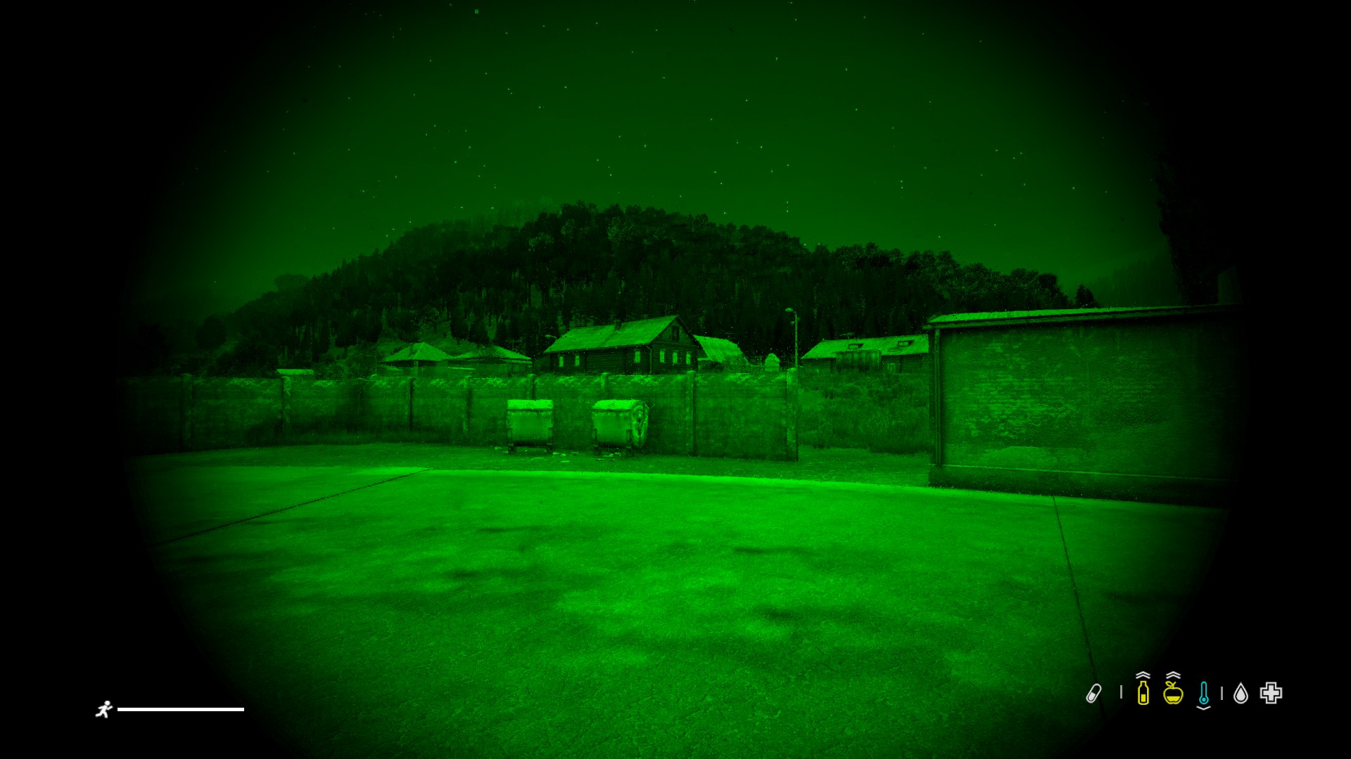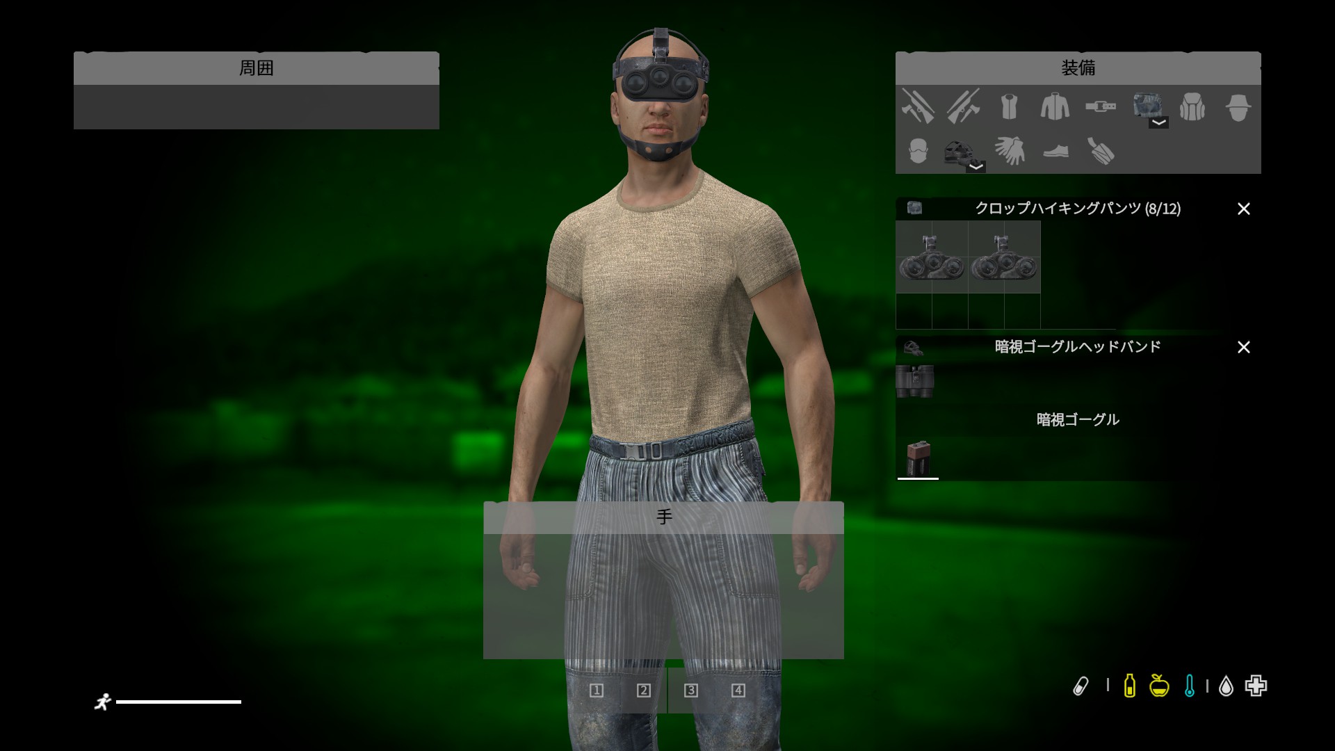 使用中はプレイヤーの視界が緑色の暗視映像に切り替わり、夜間の探索・戦闘で圧倒的な優位性を発揮します。特に 夜が暗く設定されているサーバー環境 では、暗視ゴーグルの有無で生存率が大きく変わるほど強力です。