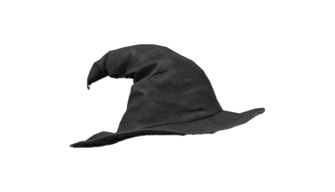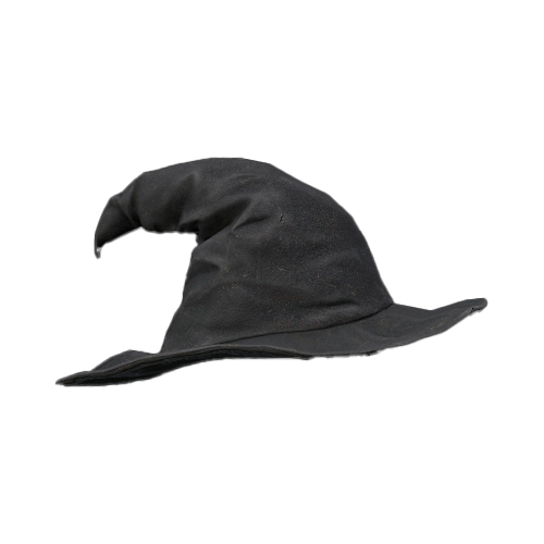 長い覆いが縫い付けられた先の尖った帽子。魔女や魔法使いが最も好むスタイル。