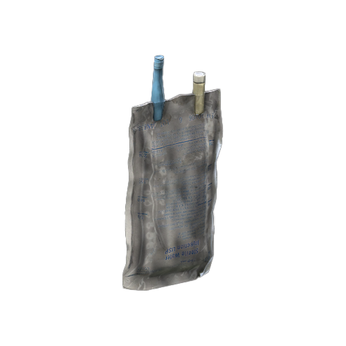 生理食塩水のバッグ。脱水症状を治療したり、血液再生を加速させるのに使用できる。これだけでは血流に投与することはできない。
