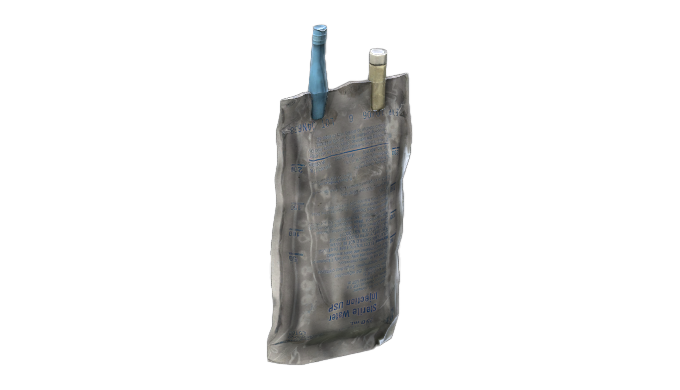 生理食塩水のバッグ。脱水症状を治療したり、血液再生を加速させるのに使用できる。これだけでは血流に投与することはできない。