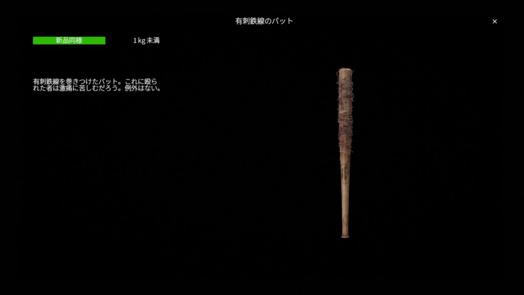 総じて、有刺鉄線のバットは 野球バットと同一のリーチおよび攻撃モーションを持つ派生装備 ですが、感染者に対する攻撃効率が低下します。そのため、 性能面では釘の出たバットの下位 に位置付けられ、感染者処理を重視する場合は野球のバットのままにしておいたほうが合理的なケースもあります。