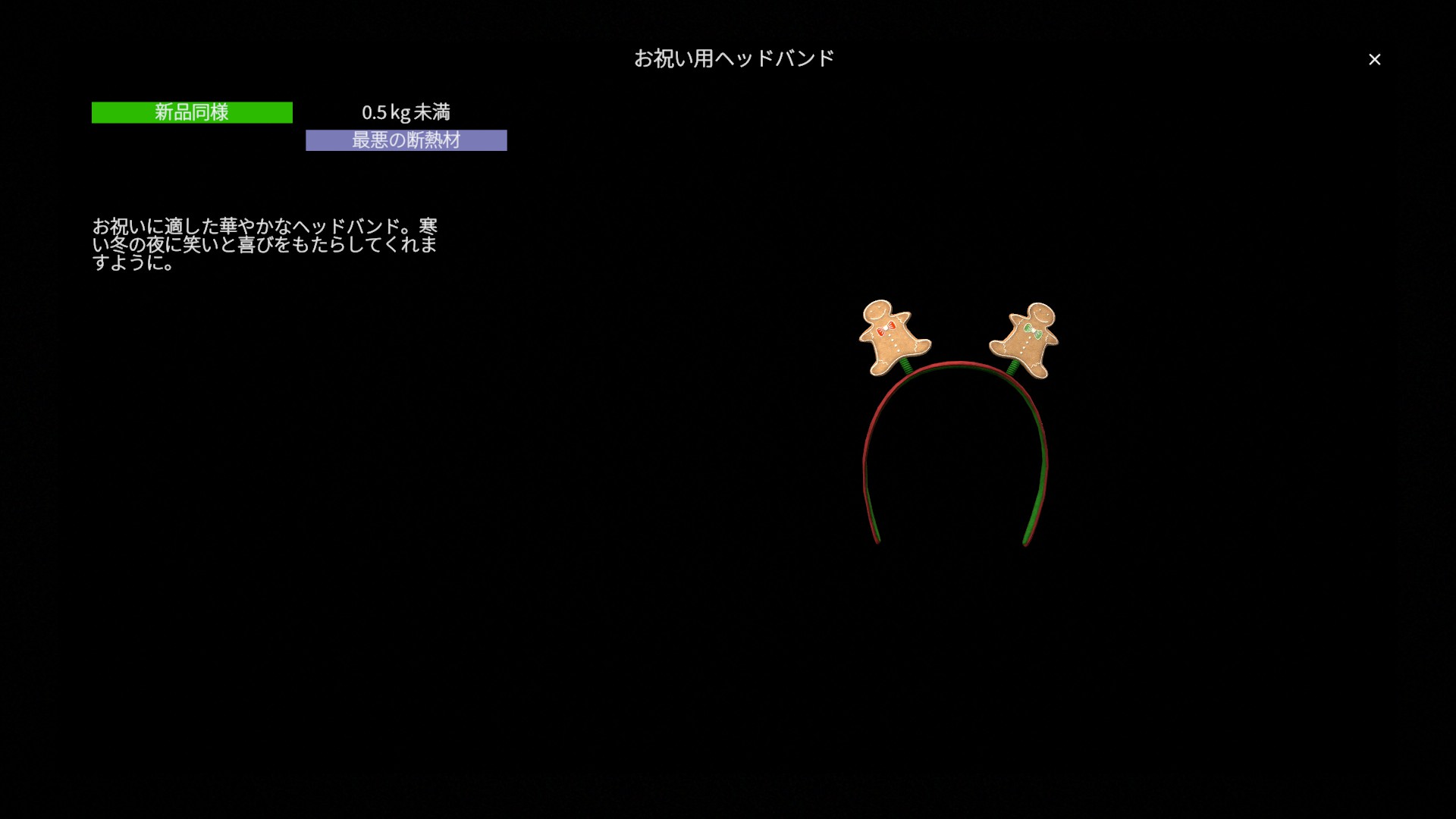 総じて、お祝い用ヘッドバンド(生姜)は 実用性よりも見た目やイベント感を重視した、クリスマスコレクション向けの頭部装備 といえるでしょう。