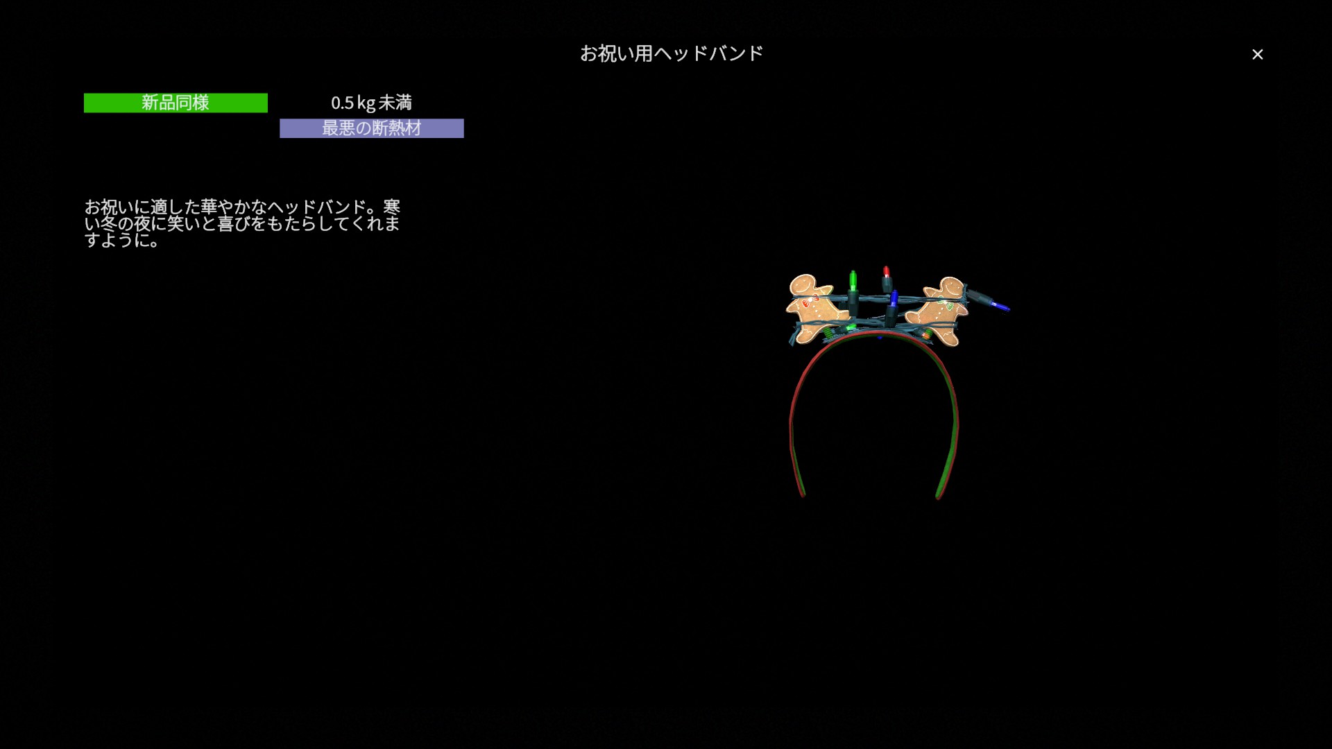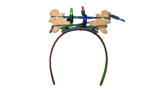 ライト付きお祝い用ヘッドバンド(生姜)(ChristmasHeadband_Lights_Gingerbread)は、クリスマスイベント期間中 に登場する頭部装備 です。 2025年のクリスマスイベント で追加されました。