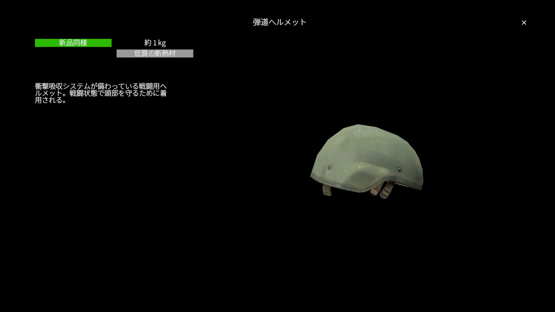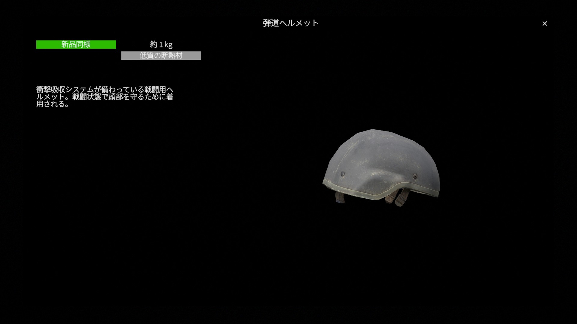 衝撃吸収システムが備わっている戦闘用ヘルメット。戦闘状態で頭部を守るために着用される。