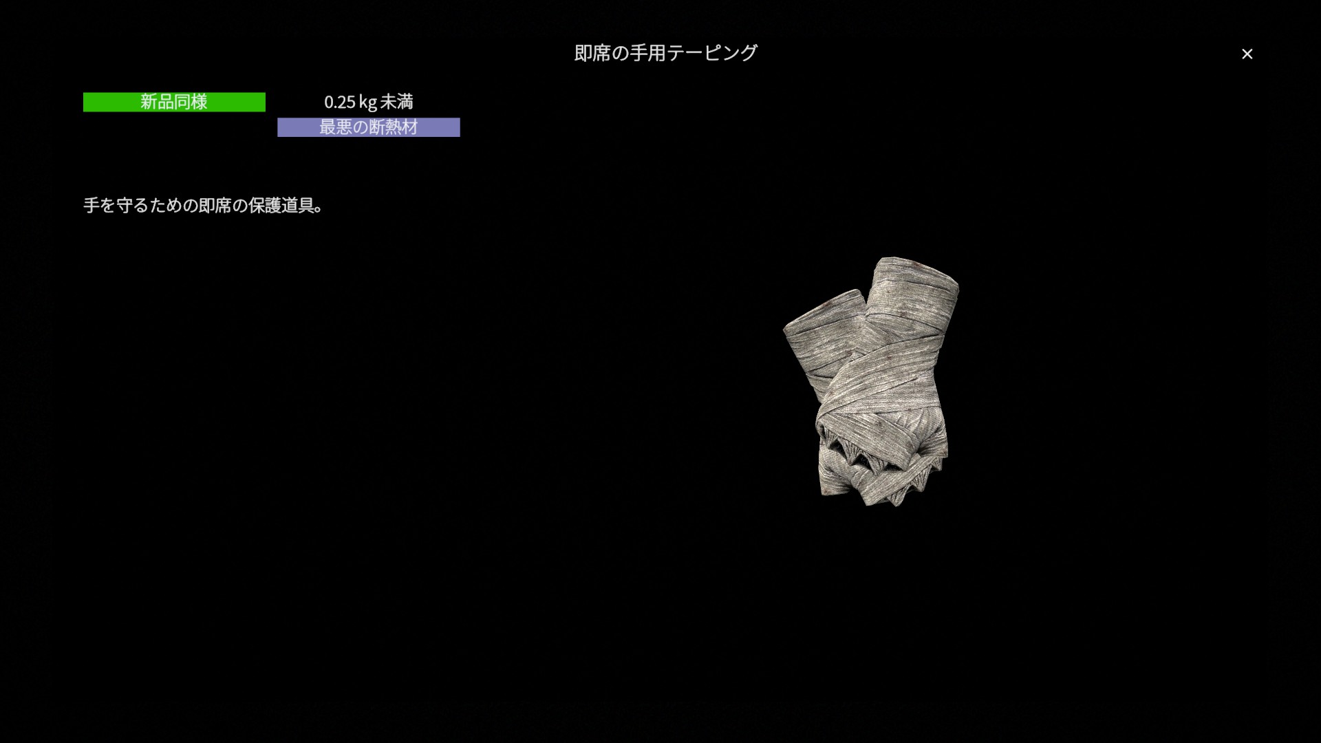 即席の手用テーピング(HandsCover_Improvised)は、ぼろ切れを巻いた簡易的な手袋装備 です。