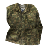 3色迷彩の軍用ジャケットで、大きなカーゴポケットが使いやすい。また、どんな天気でもそこそこ保護してくれる。