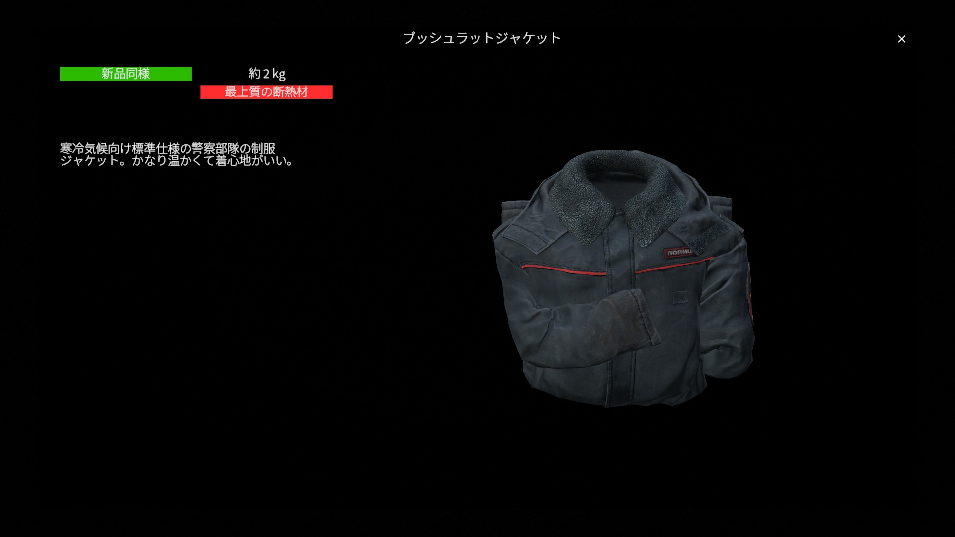 一方で、戦闘ジャケットフィールド用ジャケット と比べると重量が大きく増加しており、携行重量やスタミナ消費には注意が必要です。防寒性能を重視するか、機動力を取るかで選択が分かれる装備と言えるでしょう。