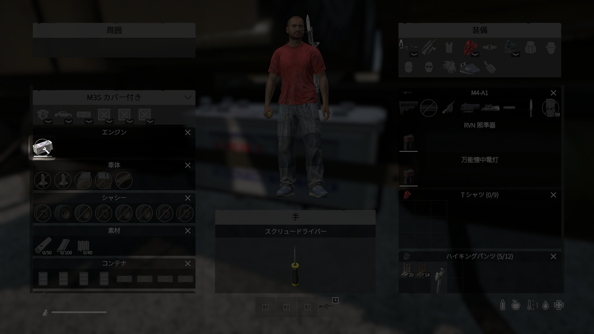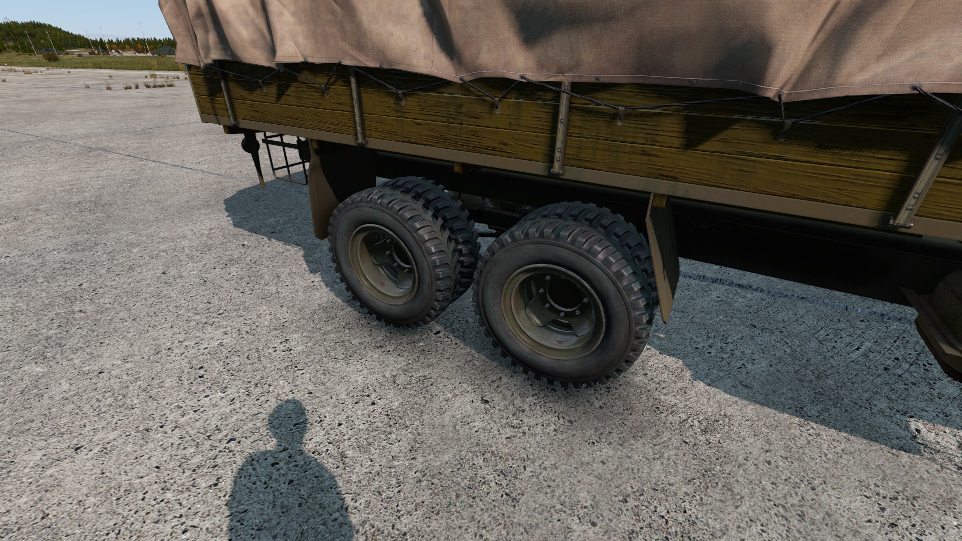 | 約60km/h | 2 | 600 | ドラム缶 x4 木製の箱 x4 | 丸太 x50 板 x100 金属板 x40 予備タイヤx 2 | 120 | トラックバッテリー | 前:M3S車輪 ×2 後:M3S複車輪 ×4 | 不可 |