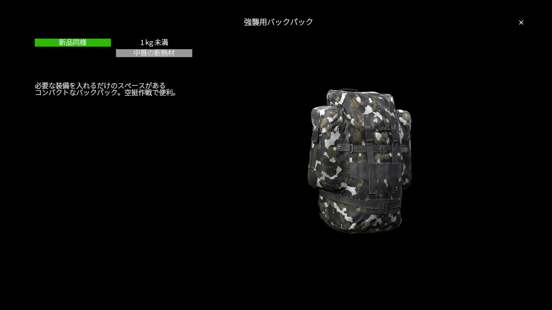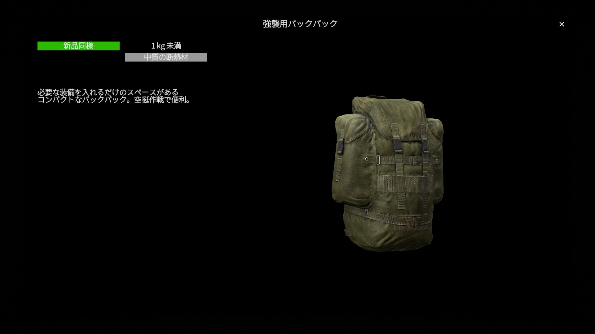 総じて強襲用バックパックは 大容量を犠牲にする代わりに、軽さ・機動力・扱いやすさを重視した軍用バックパック です。大量輸送には不向きですが、戦闘・索敵・移動を繰り返すプレイスタイルにおいて安定した性能を発揮します。 機動力と実用性のバランスを重視するプレイヤーにとって、堅実で信頼性の高い選択肢 と言えるでしょう。
