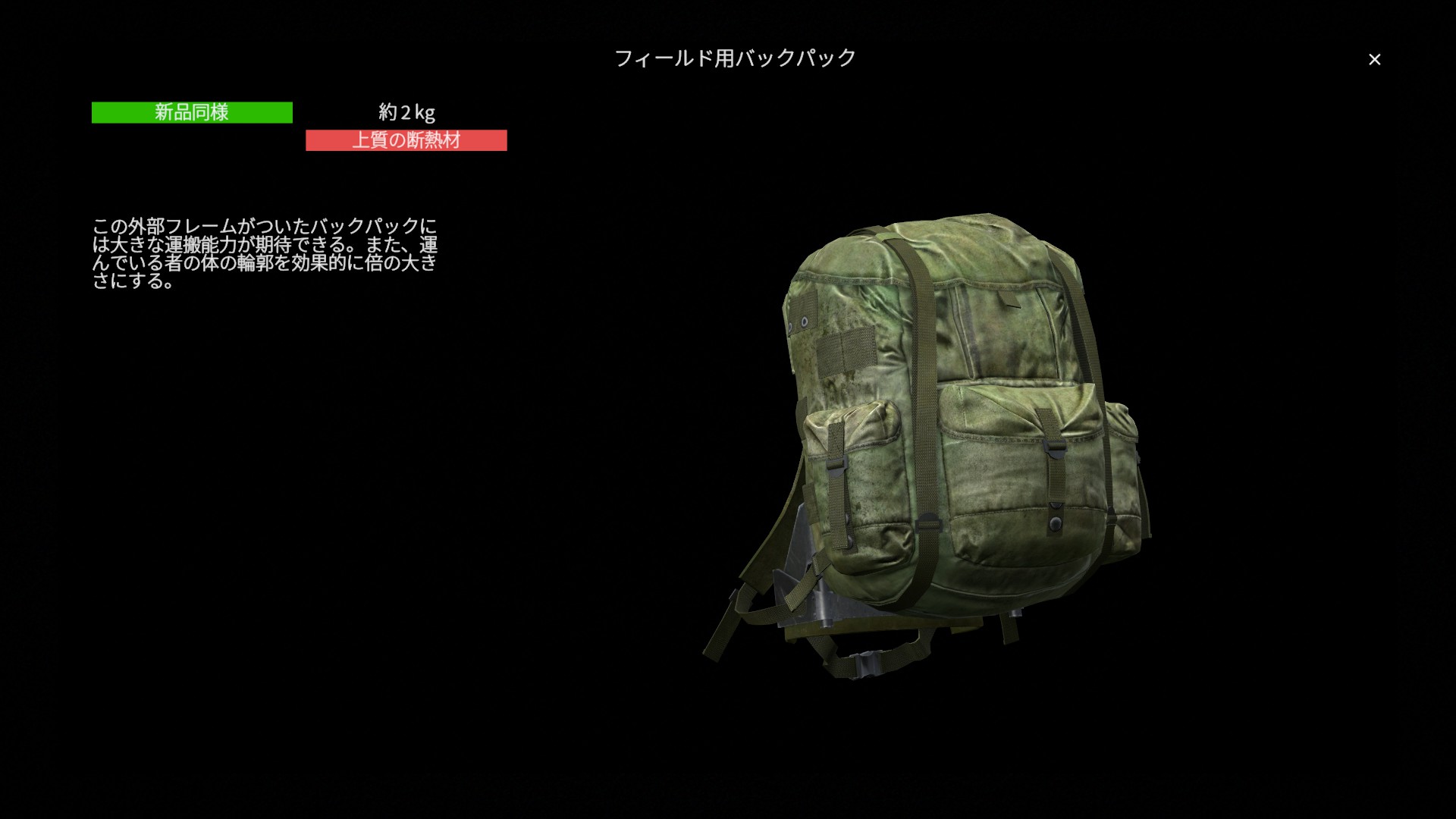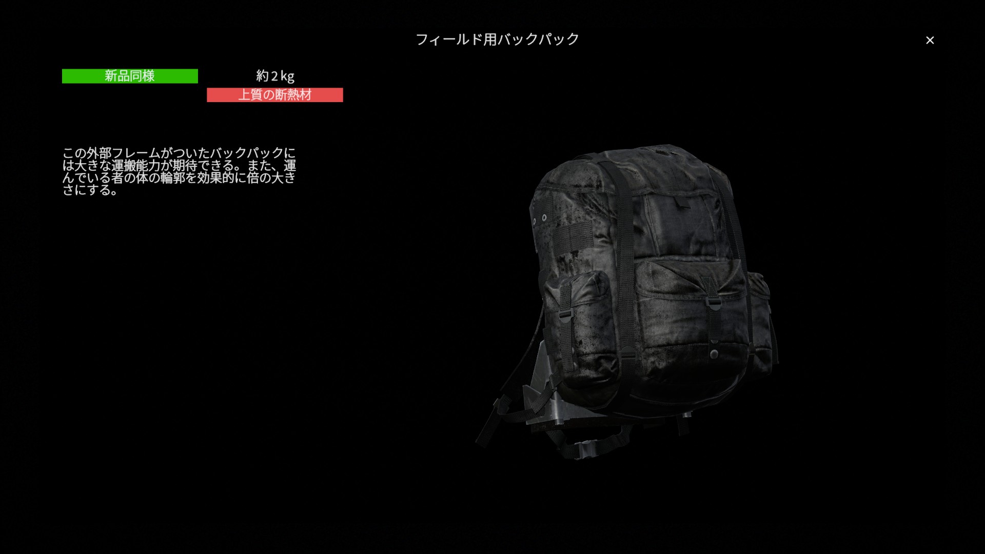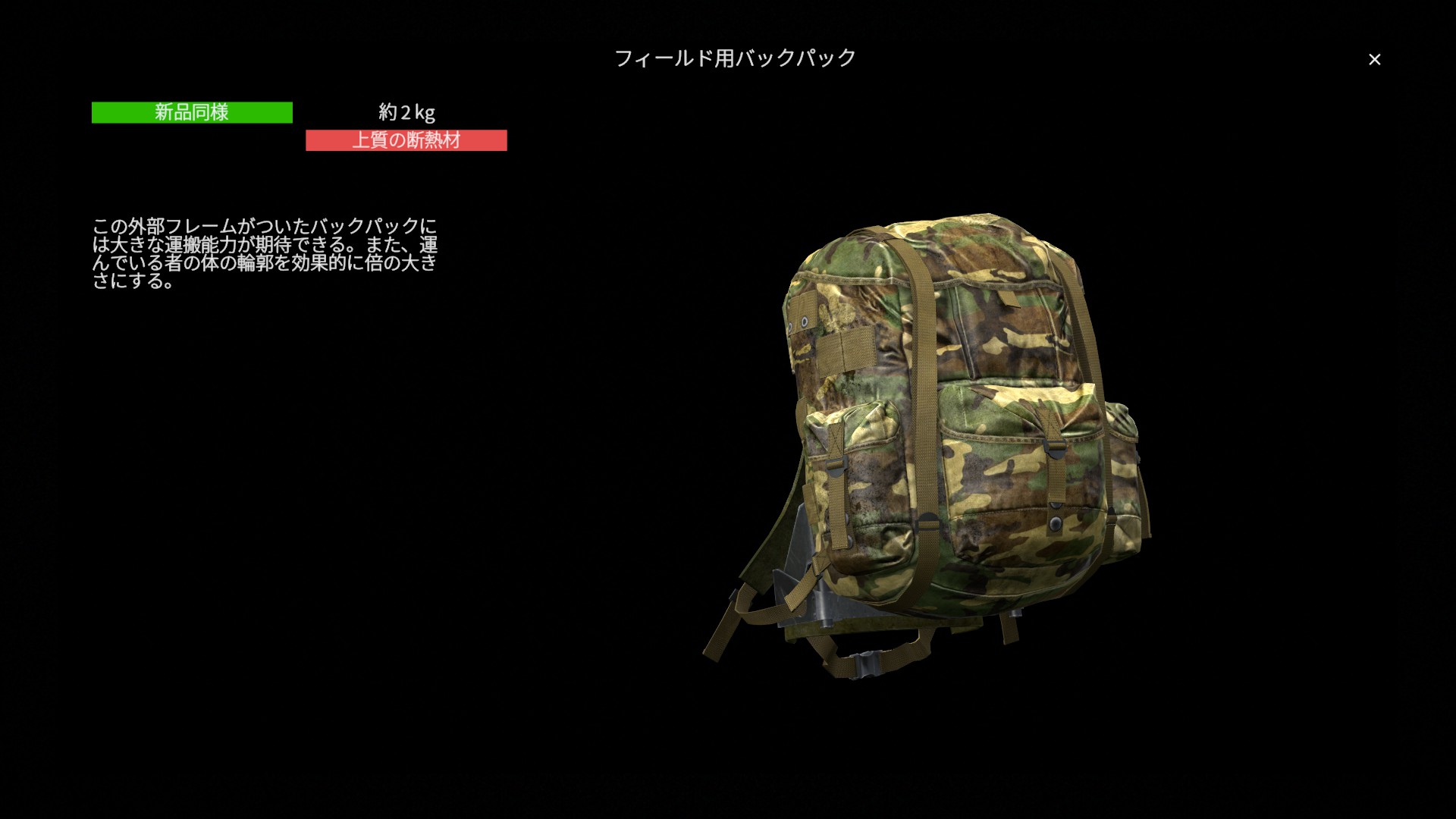 総じてフィールド用バックパックは 機動力を犠牲にする代わりに、非常に高い収納力と運搬能力を得られる大型軍用バックパック です。長距離遠征や物資回収、拠点運用を重視したプレイスタイルにおいて力を発揮し、状況に応じて小型バックパックと使い分けたい装備と言えるでしょう。