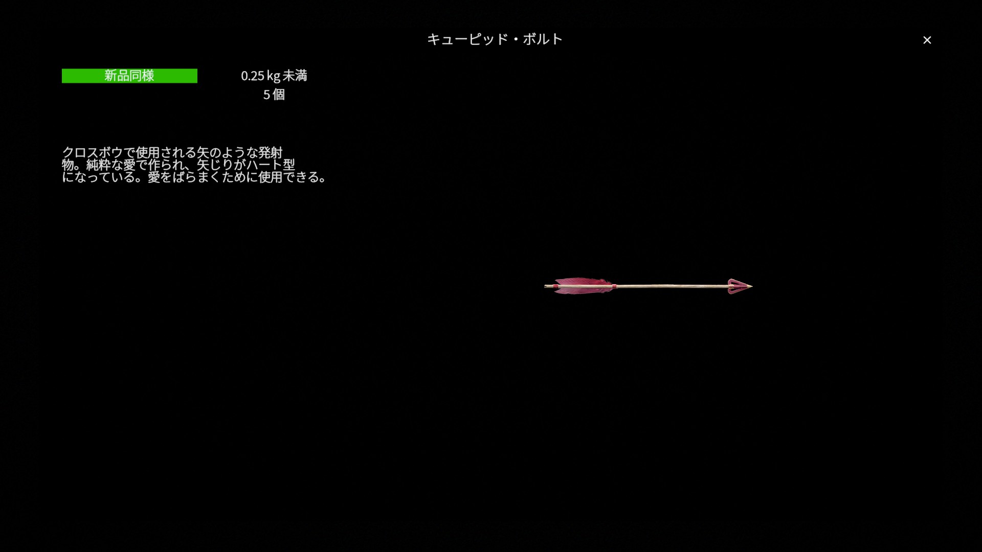 自殺(F11)で自分自身に使うことはできません( クロスボウ に キューピッドボルト を装填した状態でF11を押しても何も起きません)。また、空高く打ち上げて、着弾地点まで走ってボルトを身に受けても効果は得られませんでした(検証済み)。