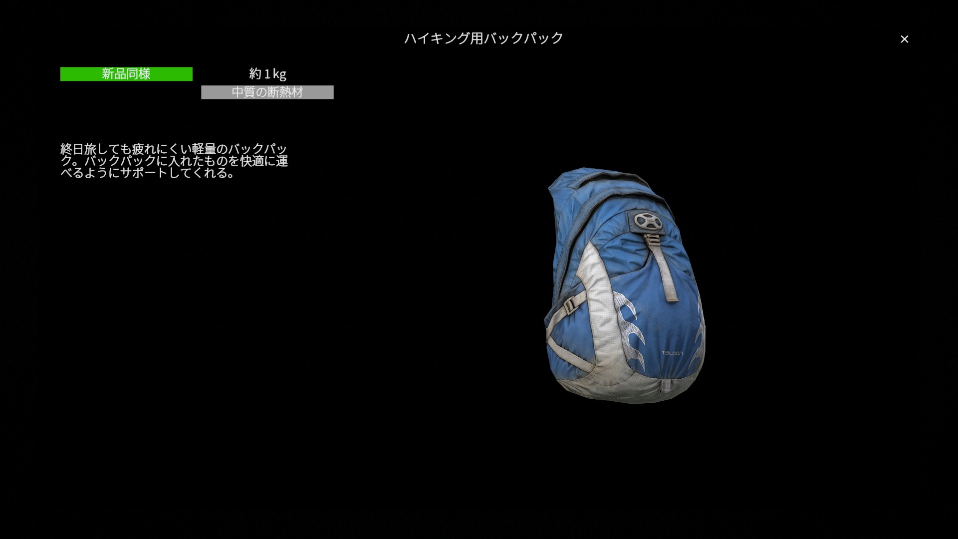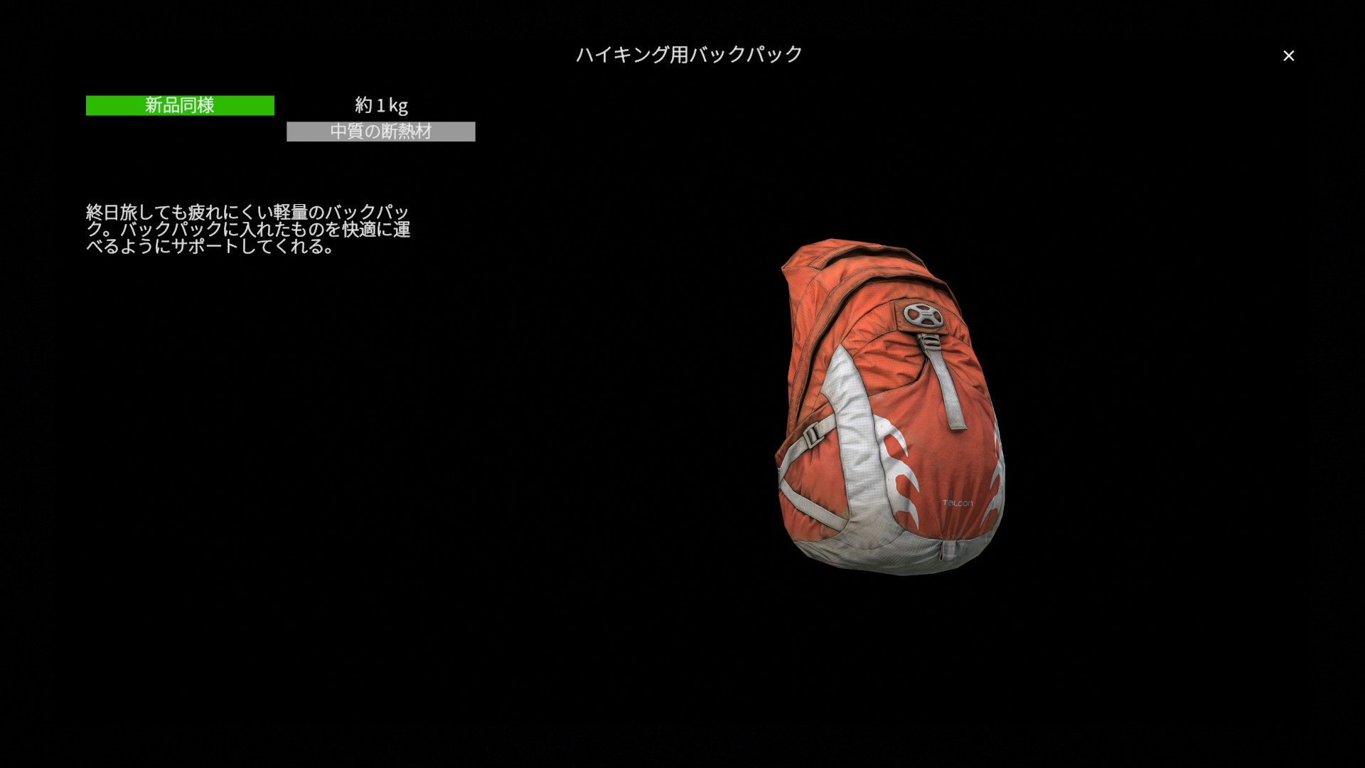 総じてハイキング用バックパックは 高い機動力と扱いやすさを重視した軽量バックパック であり、探索や移動を中心としたプレイに適した装備と言えるでしょう。序盤のつなぎ装備としてはもちろん、軽装で行動したい場面で選択肢となります。