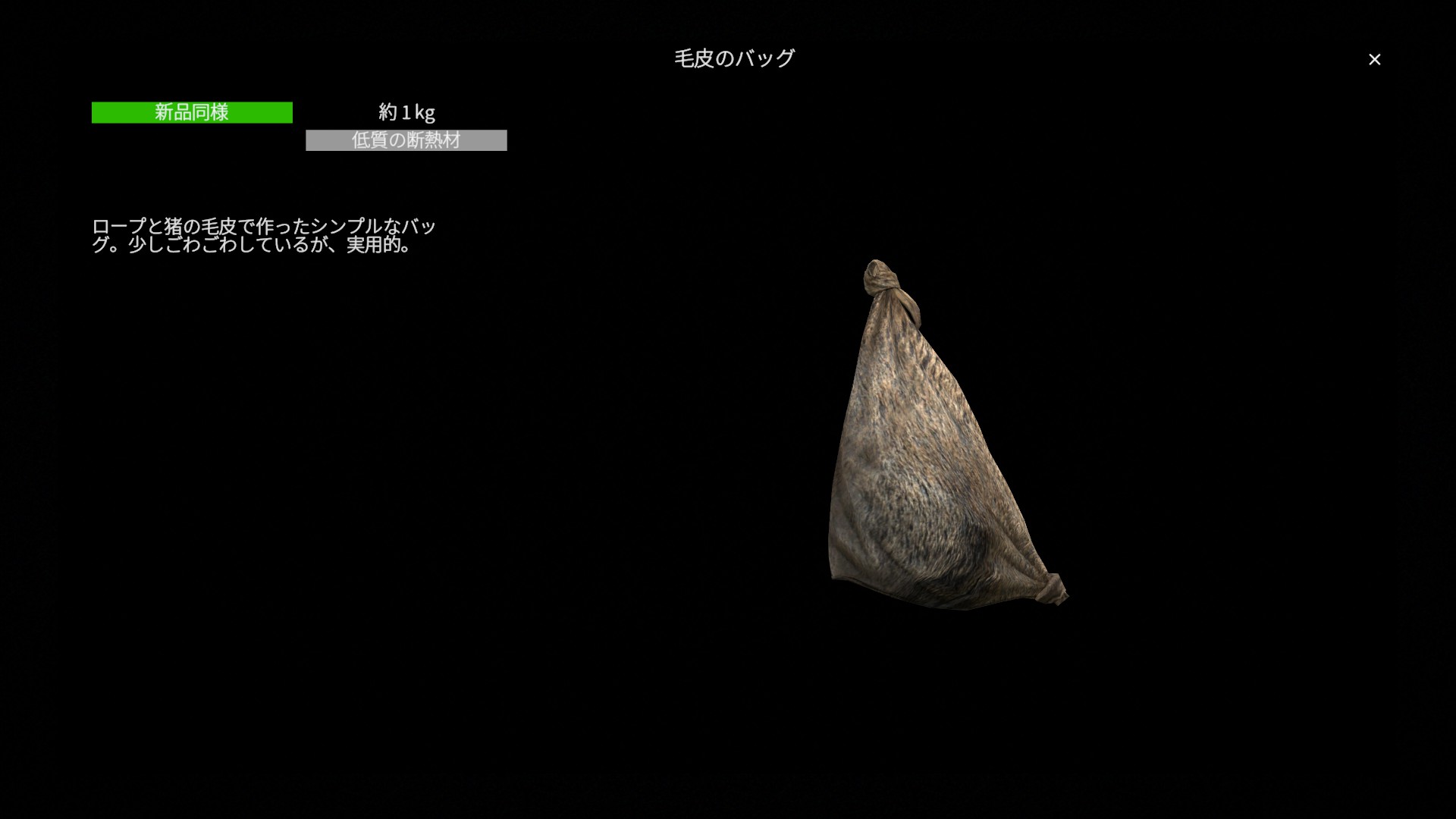 総じて毛皮のバッグは 黄麻布のバッグと比べると耐久性がわずかに高い、クラフト可能な自然素材の小型バックパック です。収納力は同等で大きな差はありませんが、素材の再利用が可能である点は共通しており、狩猟や自然素材を活用したサバイバルを重視するプレイと相性の良い装備です。ただし入手までの工程を考えると実用機会はやや限られ、用途を選ぶ装備という位置づけになります。