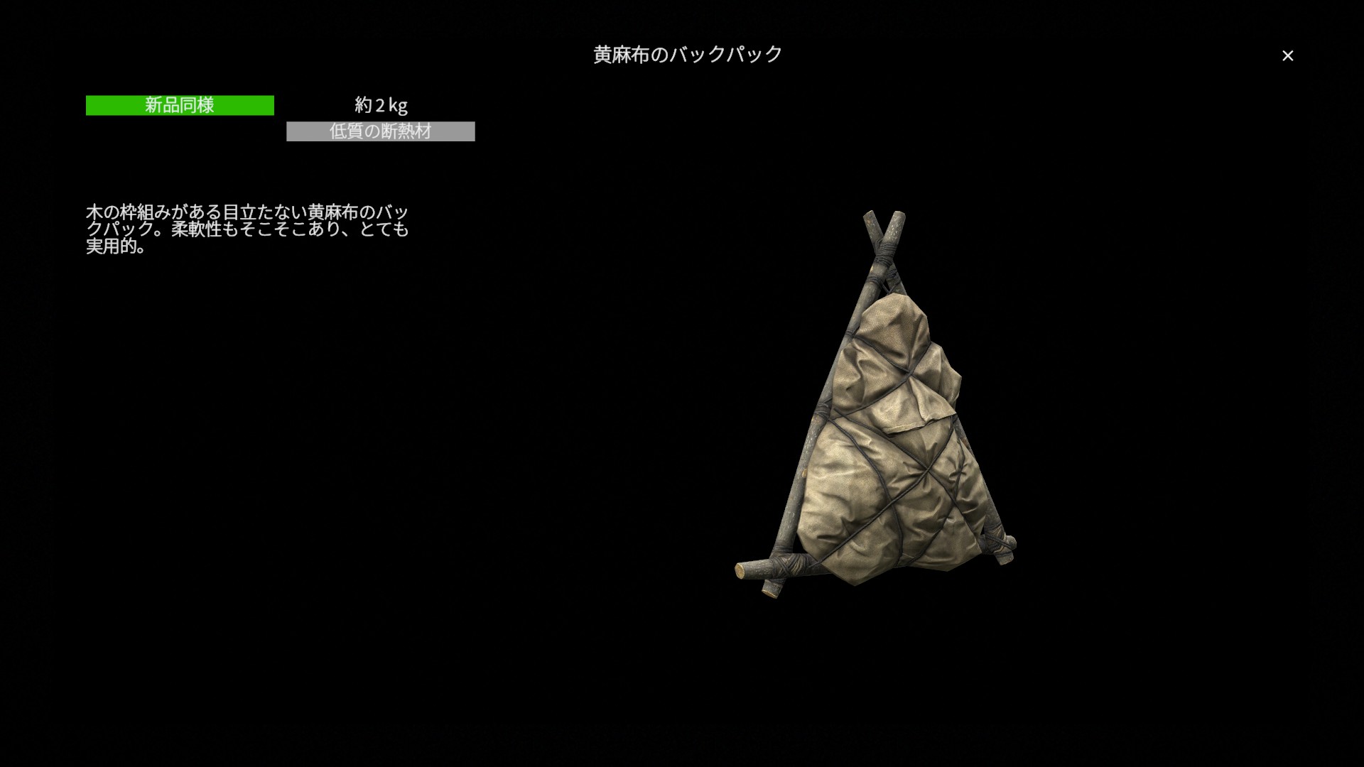 総じて黄麻布のバッグパックは クラフトによって入手できる中型バックパックの中でも、収納力を重視した実用寄りの装備 です。重量は重めで機動力への影響は小さくありませんが、その分しっかりとした容量を確保できます。断熱性能は控えめで吸水量も多いため環境適性は高くありませんが、自然素材から作成できる点と十分な収納力を兼ね備えた、サバイバル色の強いバックパックという位置づけになります。
