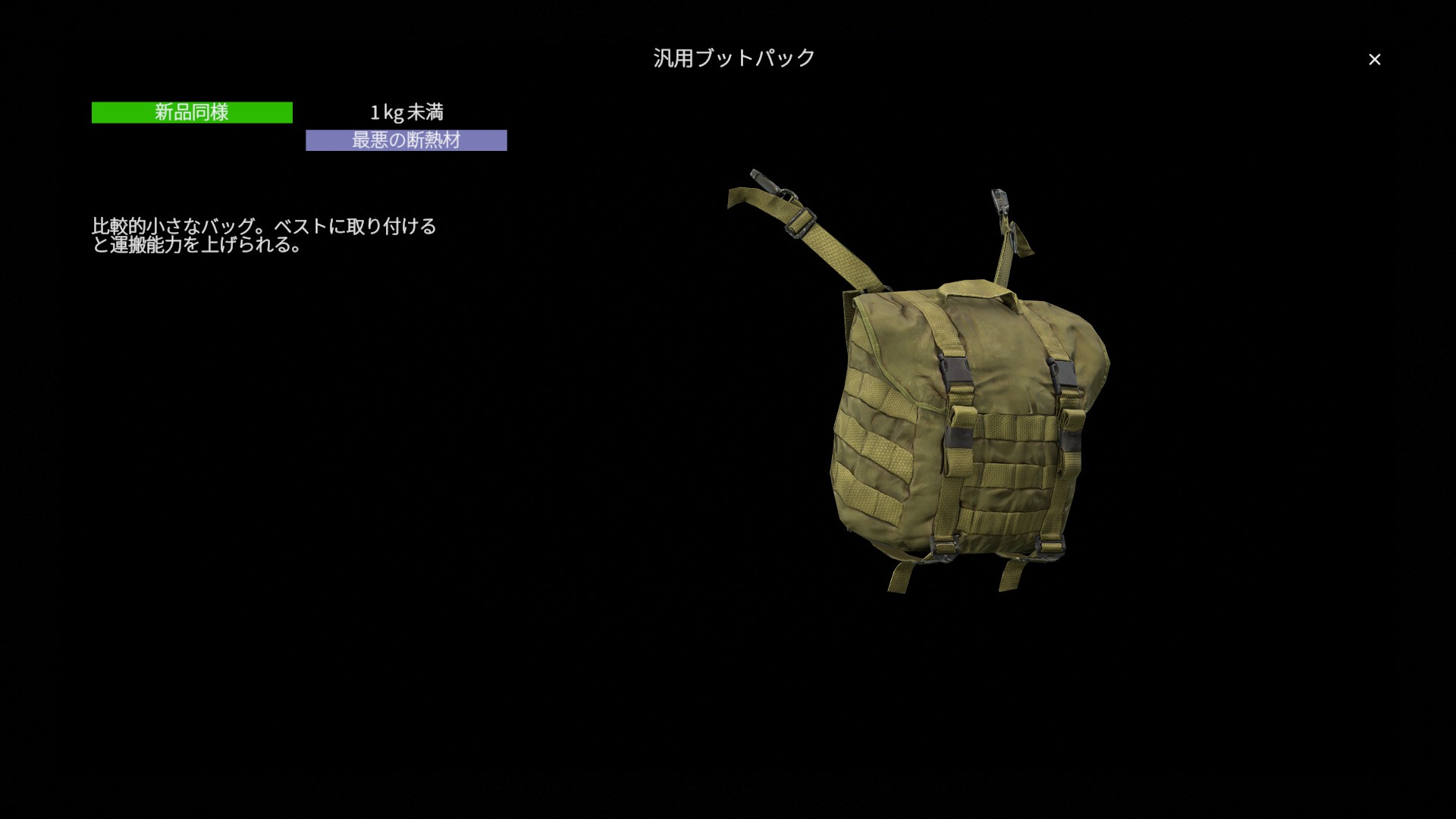 総じて汎用ブットパックは 軽量さと拡張性を重視した小型バックパック です。容量自体は控えめですが、重量は非常に軽く、機動力への影響を最小限に抑えられます。特に 強襲用ベスト と組み合わせることで携行能力を効率よく拡張できる点が大きな強みです。単体での大容量運搬には向きませんが、スピードと取り回しを重視しつつ必要最低限の装備を持ち歩きたい場面に適した、機動戦向けの実用装備と言えるでしょう。