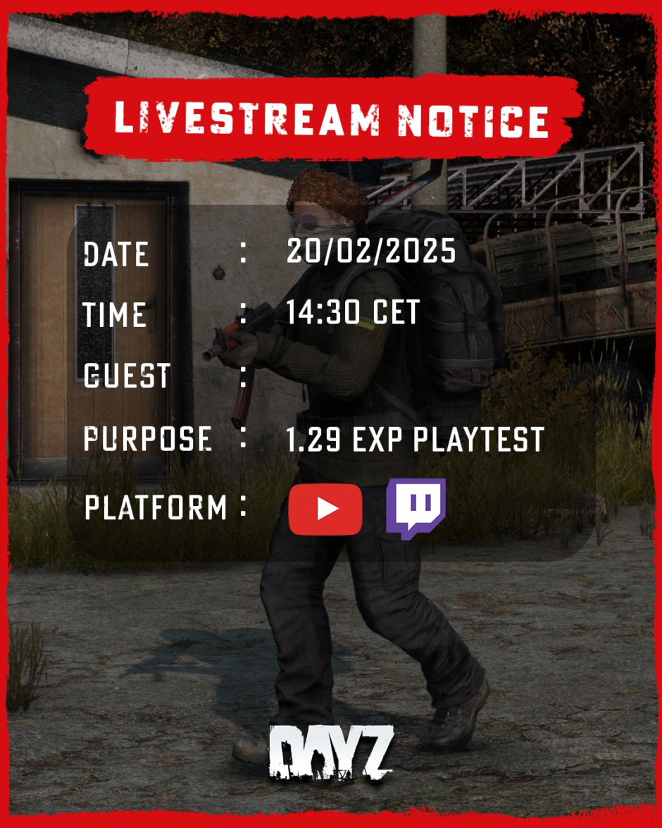 2026年2月20日22:30(JST)に「Join The DayZ Devs As They Playtest 1.29 Update Exp!!」がありました。