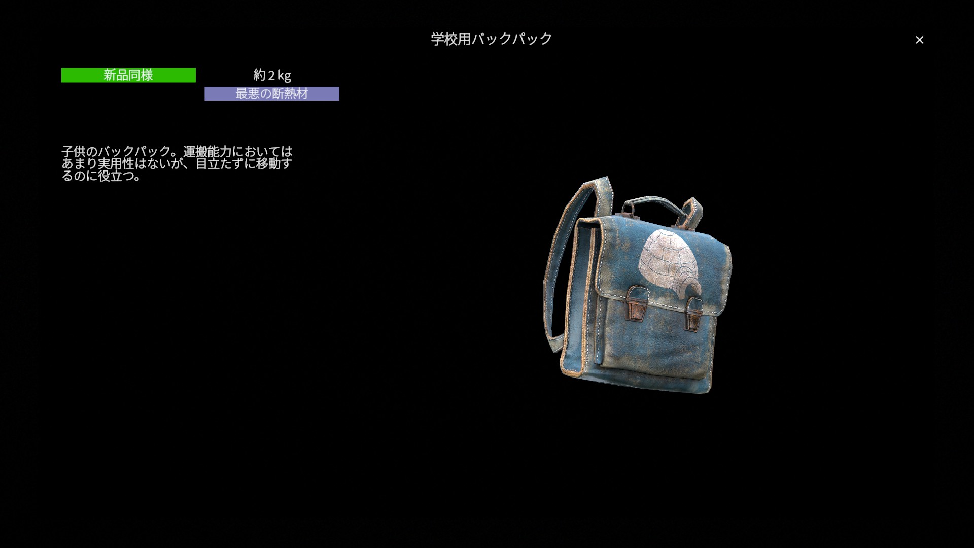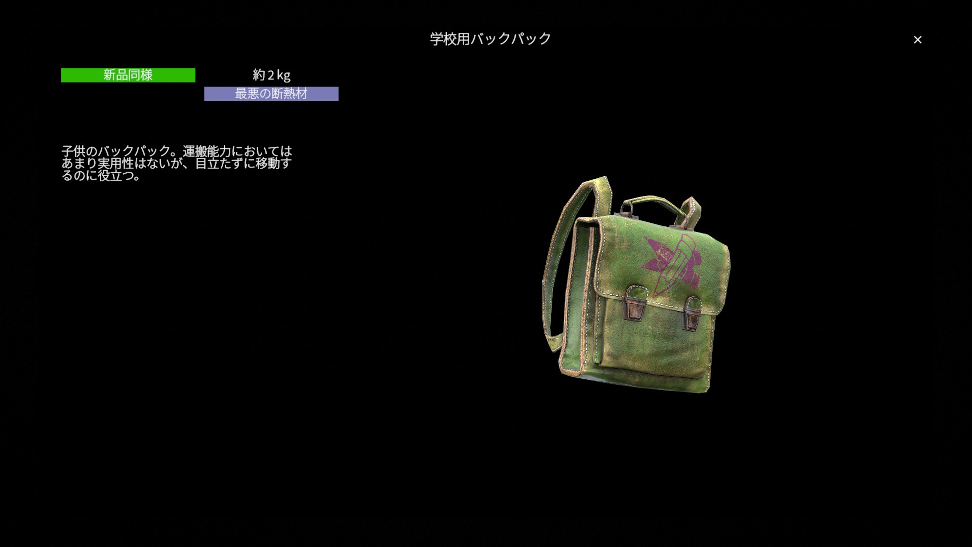 総じて学校用バックパックは 序盤向けの小型バックパック です。収納容量は最低限ながら重量は重く、性能面での強みは限定的です。早期のつなぎ装備としては活用できますが、より軽量で高性能なバックパックへの乗り換えを前提とした一時的な装備と言えるでしょう。
