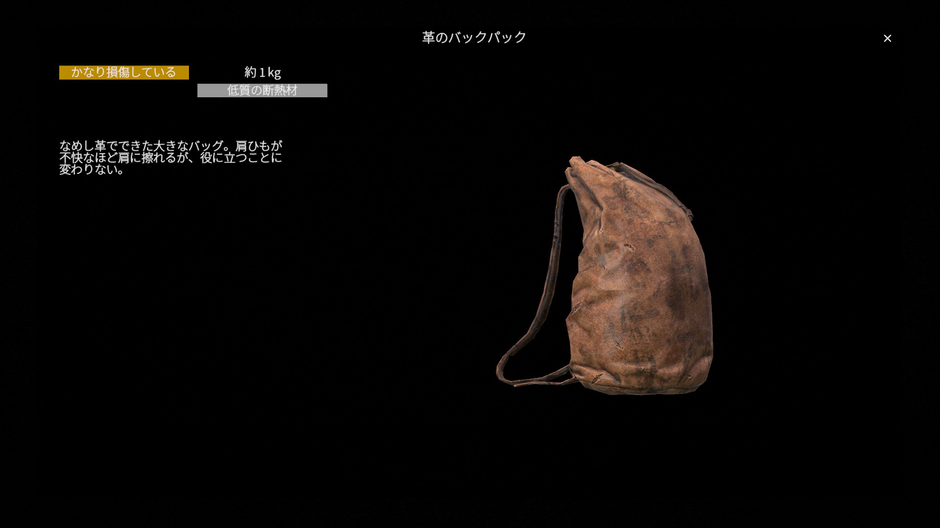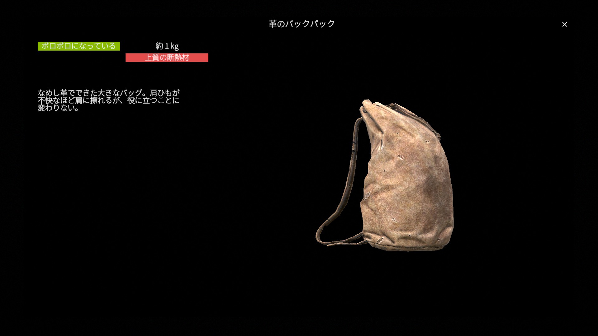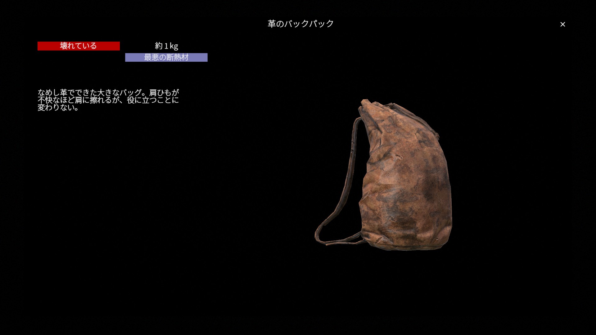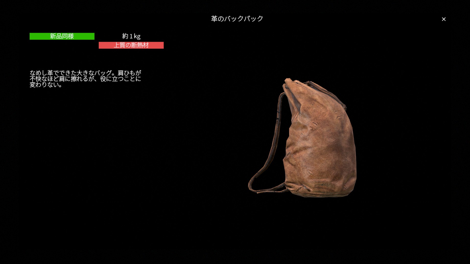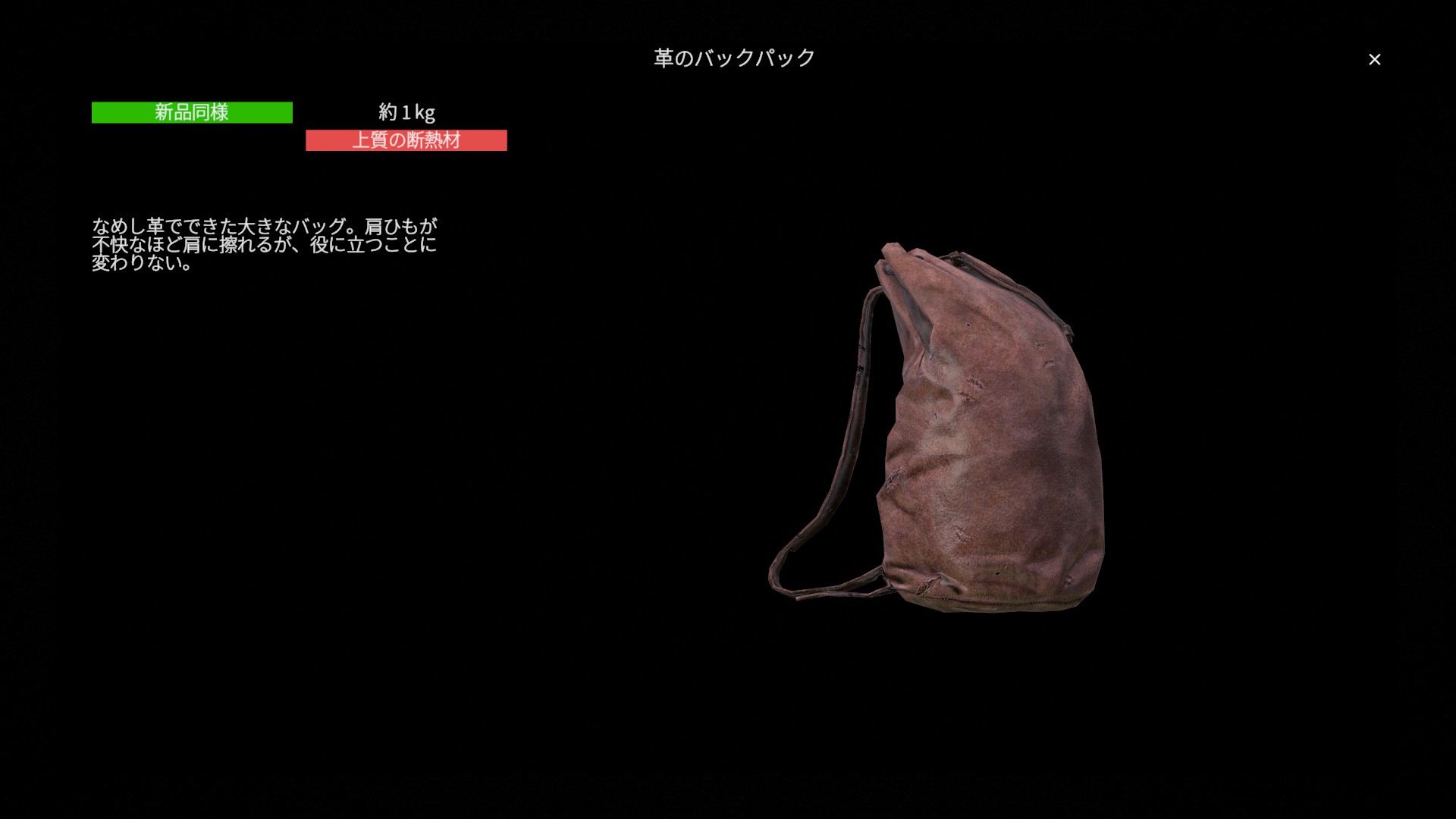 総じて革のバックパックは 高容量・高耐久・高断熱を兼ね備えた優秀なクラフト装備 です。収納力は大型バックパック級ながら重量は比較的抑えられており、寒冷地や長時間探索にも安定して対応できます。素材の確保は必要ですが、完成すれば最終装備候補になり得る実用性の高いバックパックと言えるでしょう。