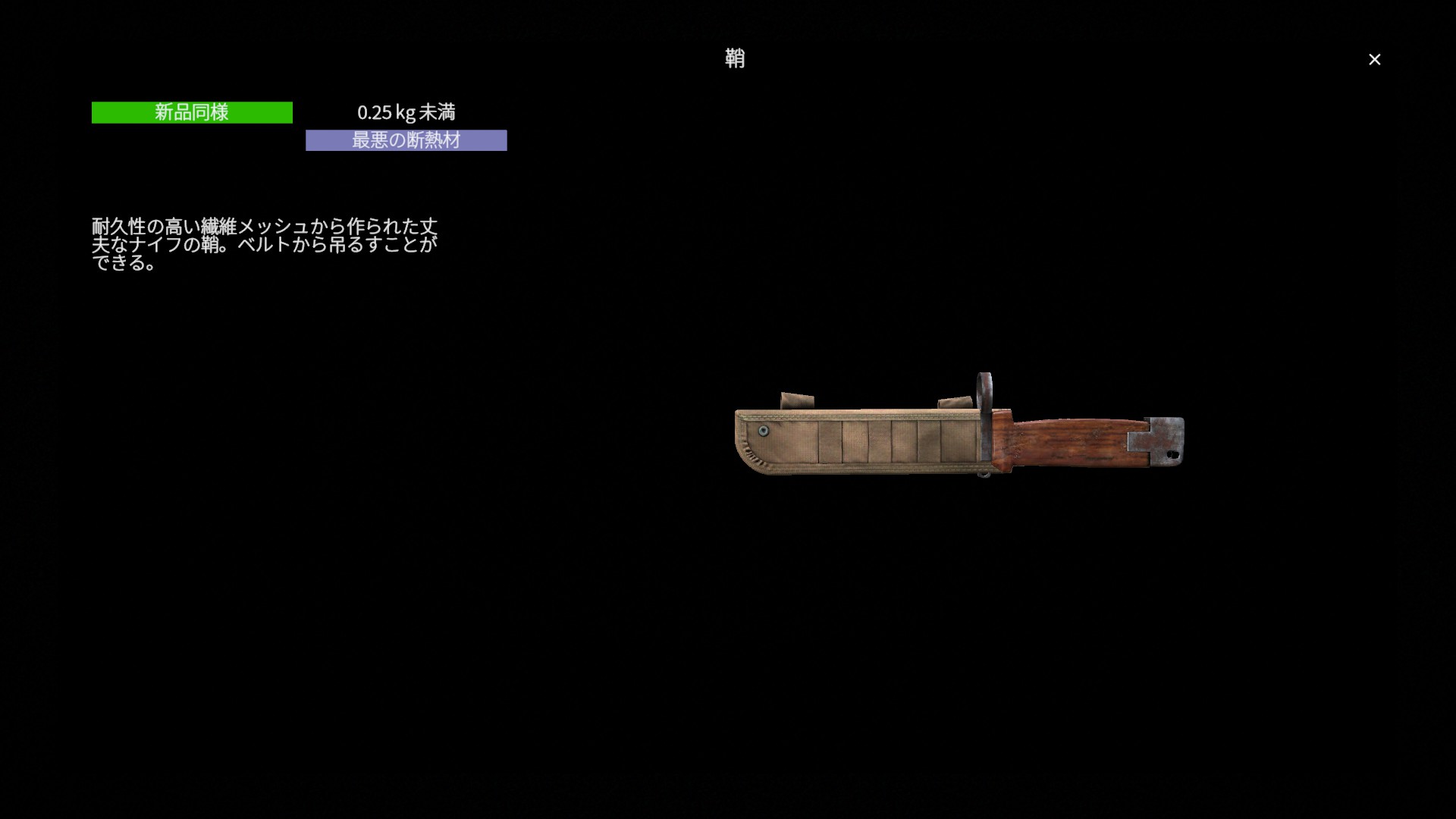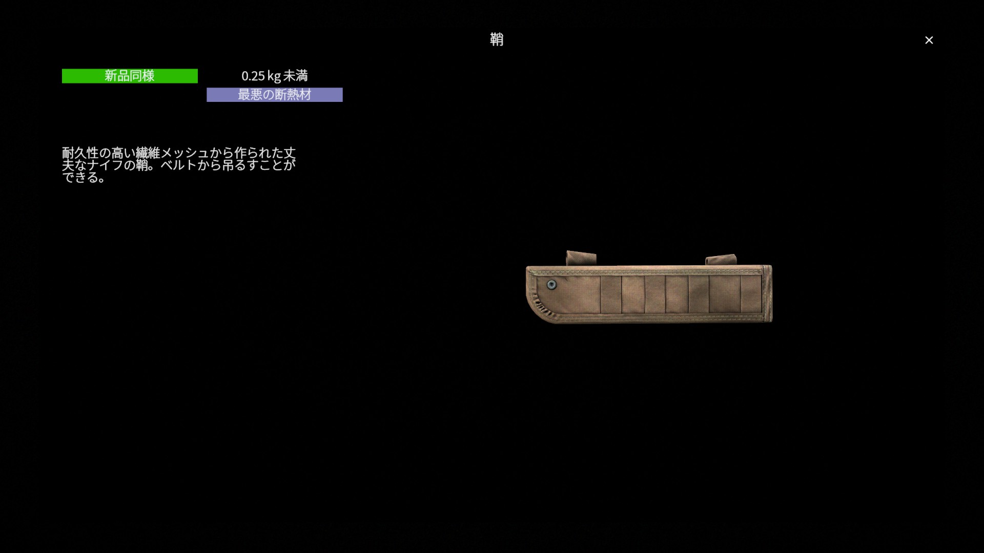 総じて鞘は ベルト装備の機能を拡張する装備アタッチメント です。ナイフを専用スロットに装着して携行できるようになるほか、ホルスターに収納されたナイフは装備ダメージの影響を受けないため、探索や戦闘時にナイフを安全に携行できる実用的な装備です。