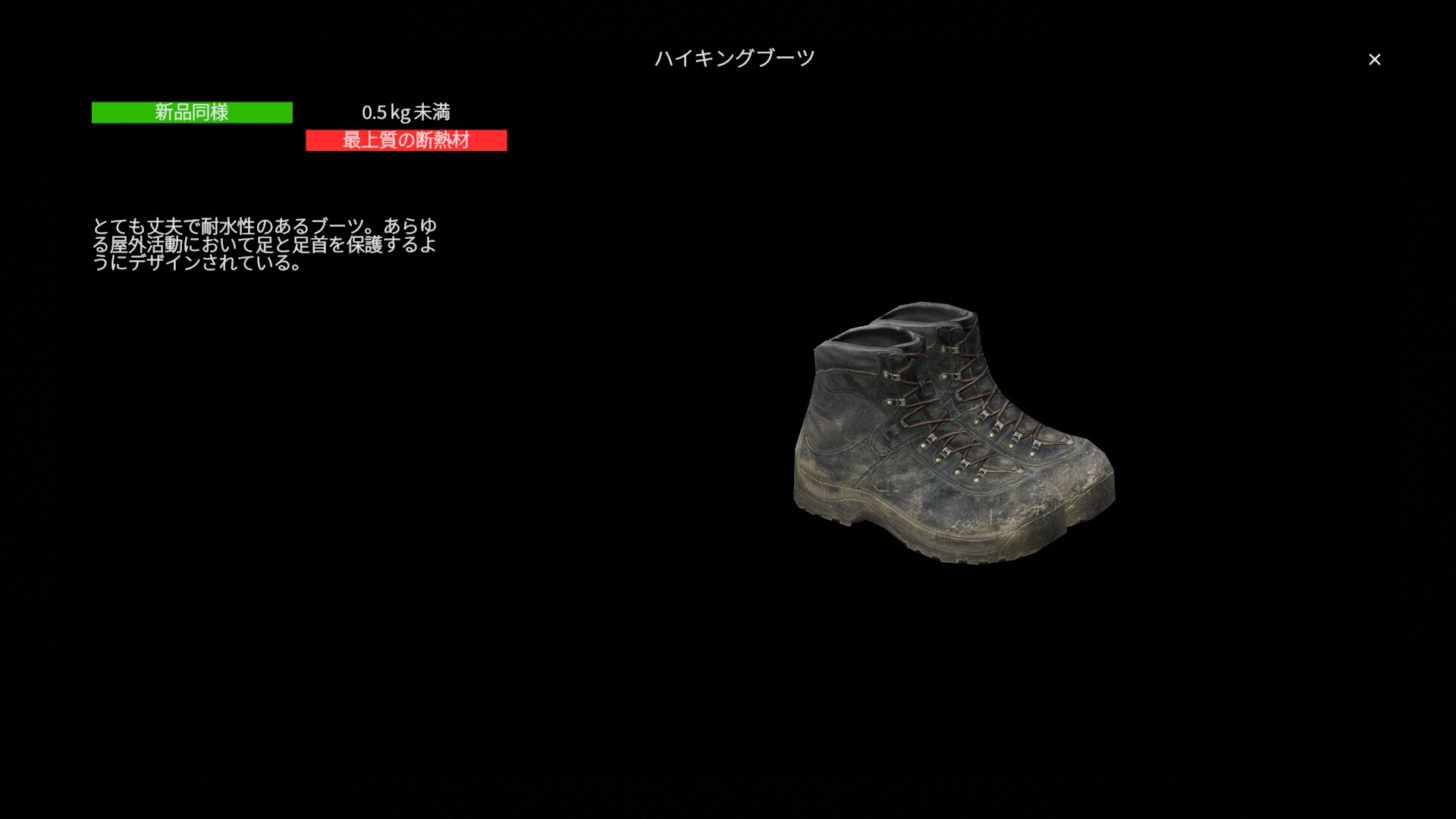 総じてハイキングブーツは 耐久性と防寒性能に優れた中〜終盤向けの靴 です。重量はあるものの、安定した性能で長期間の運用に適しており、特に寒冷環境で真価を発揮します。