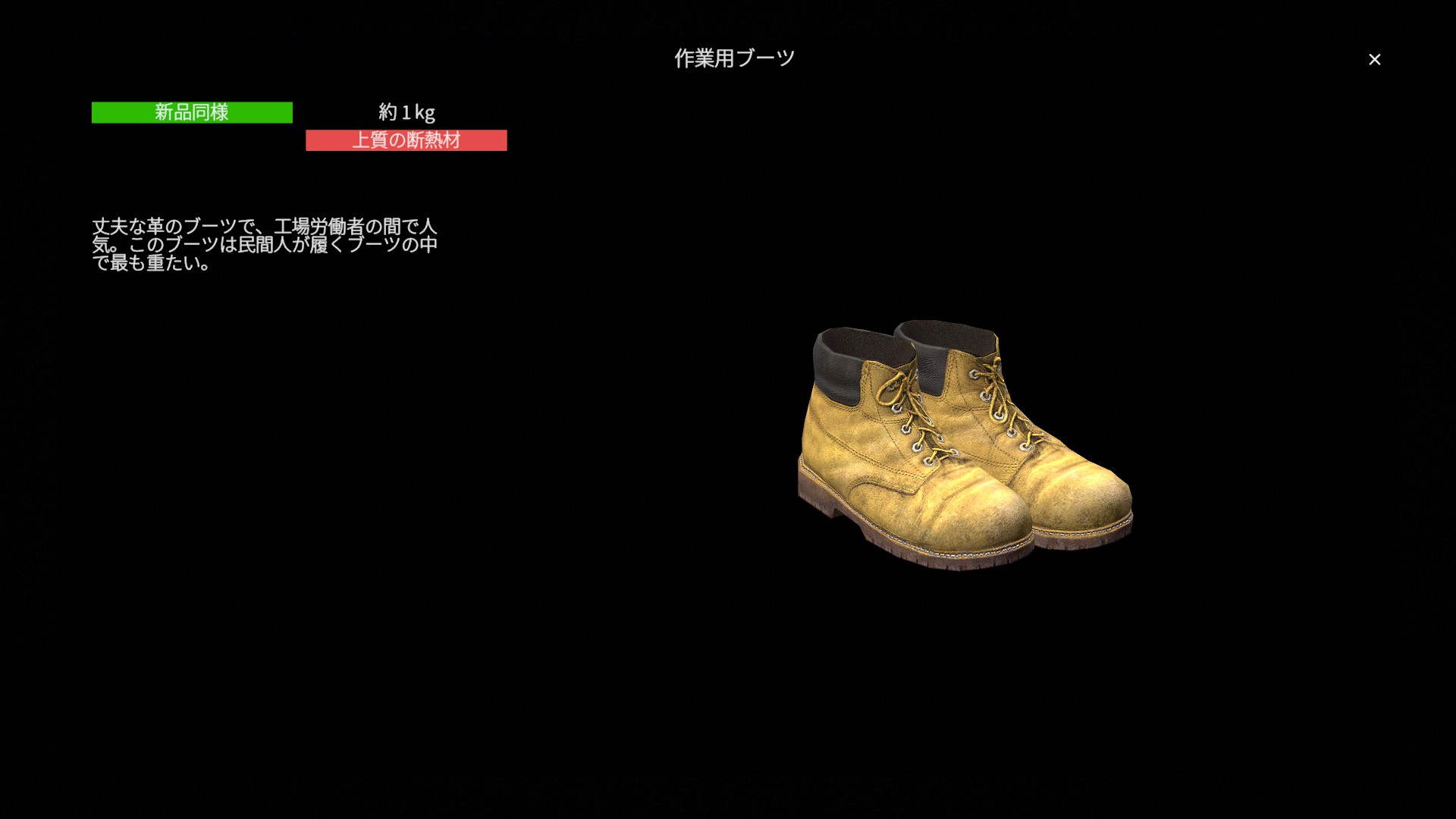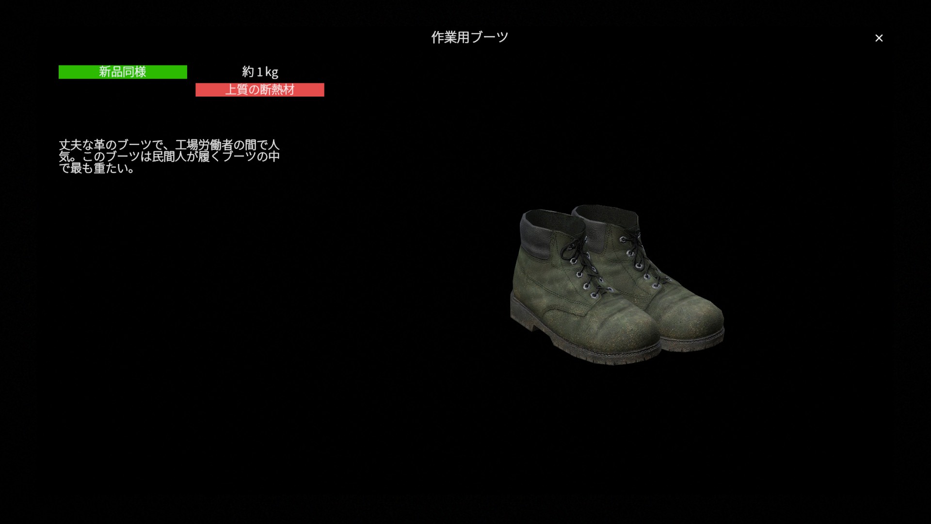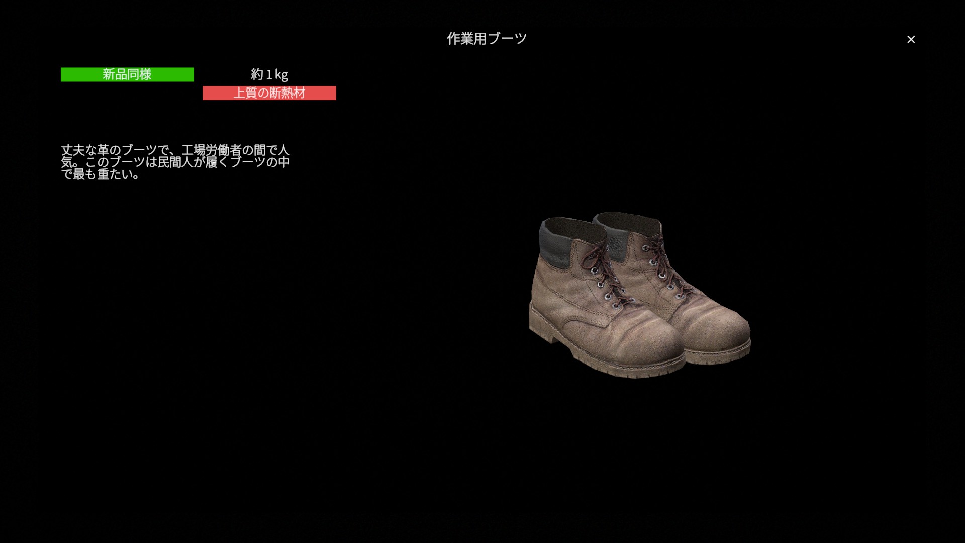 丈夫な革のブーツで、工場労働者の間で人気。このブーツは民間人が履くブーツの中で最も重たい。