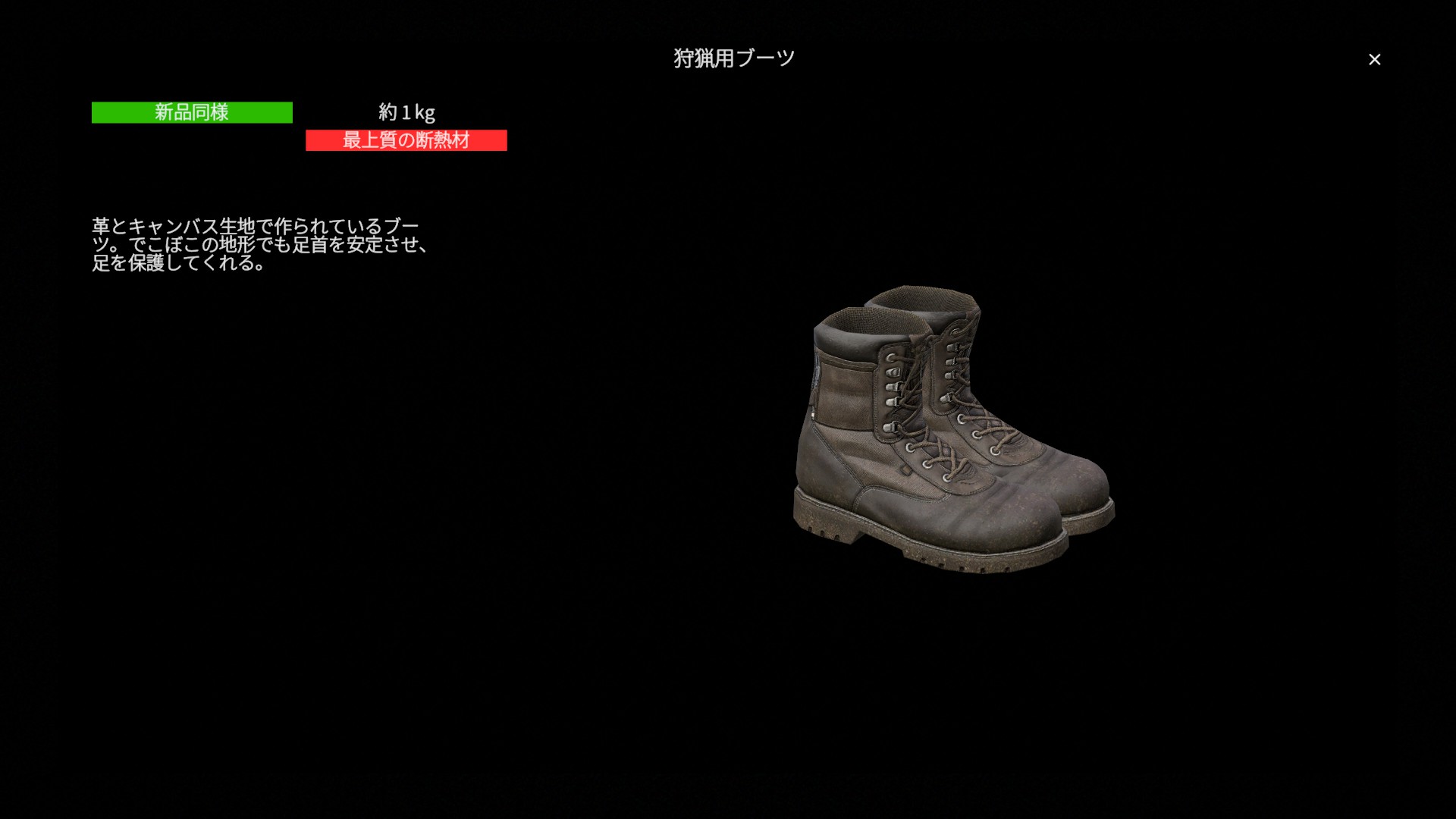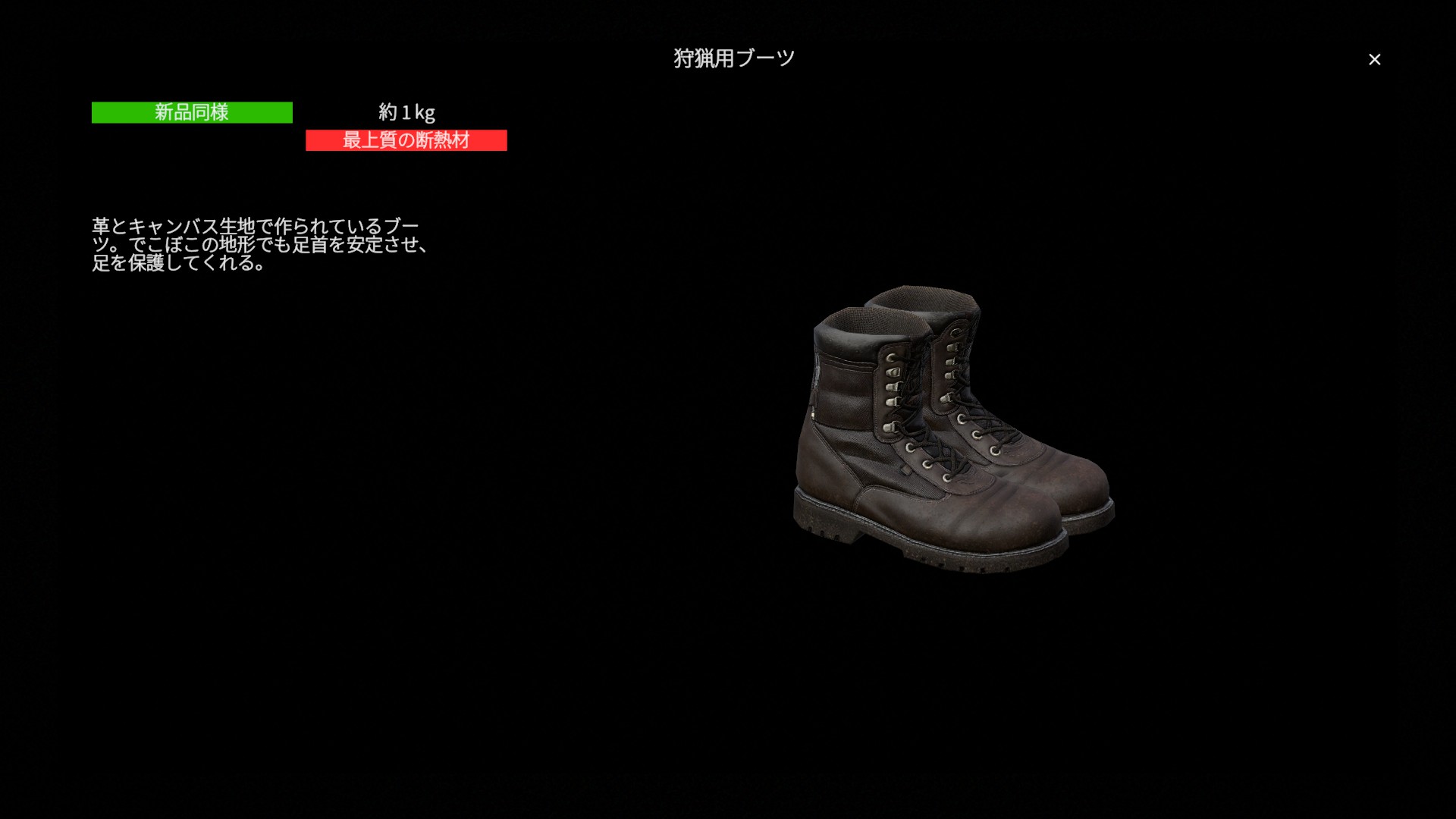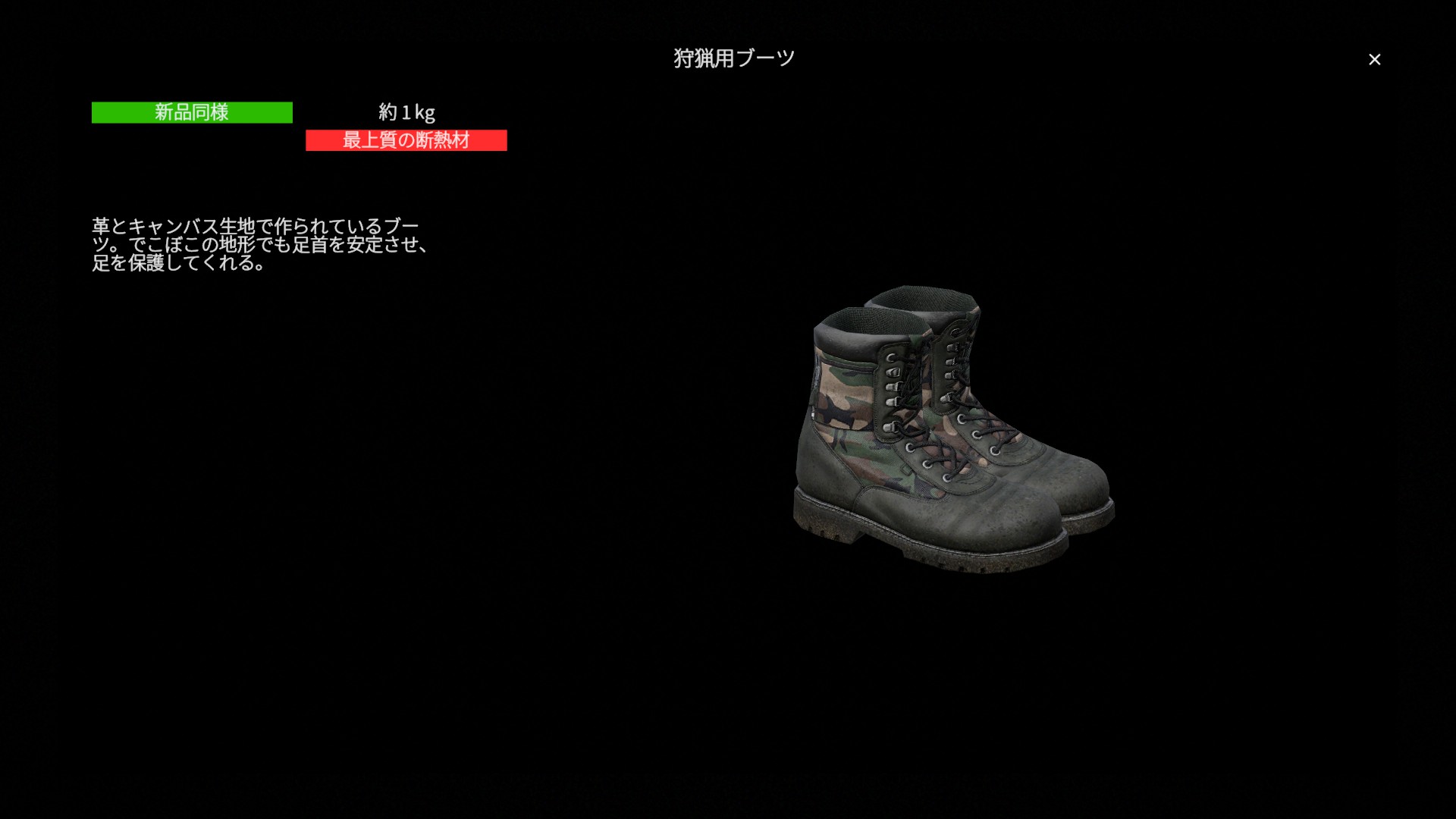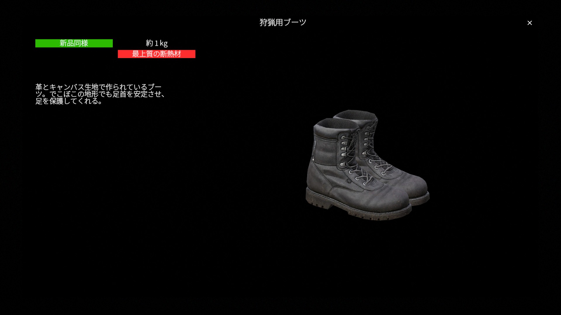 狩猟用ブーツ(CombatBoots)は 高い耐久性と防寒性能を備えた実用的なブーツ です。