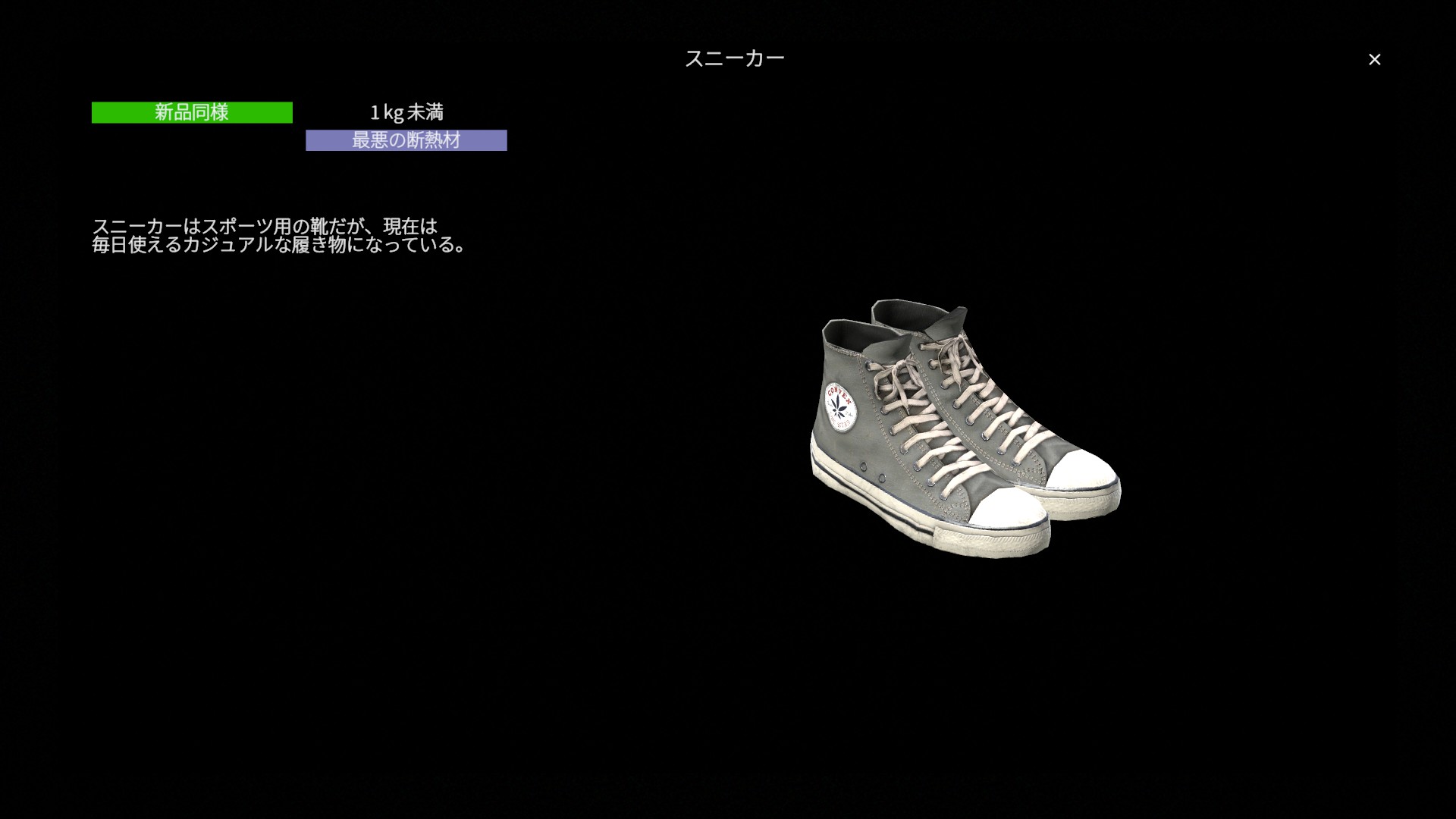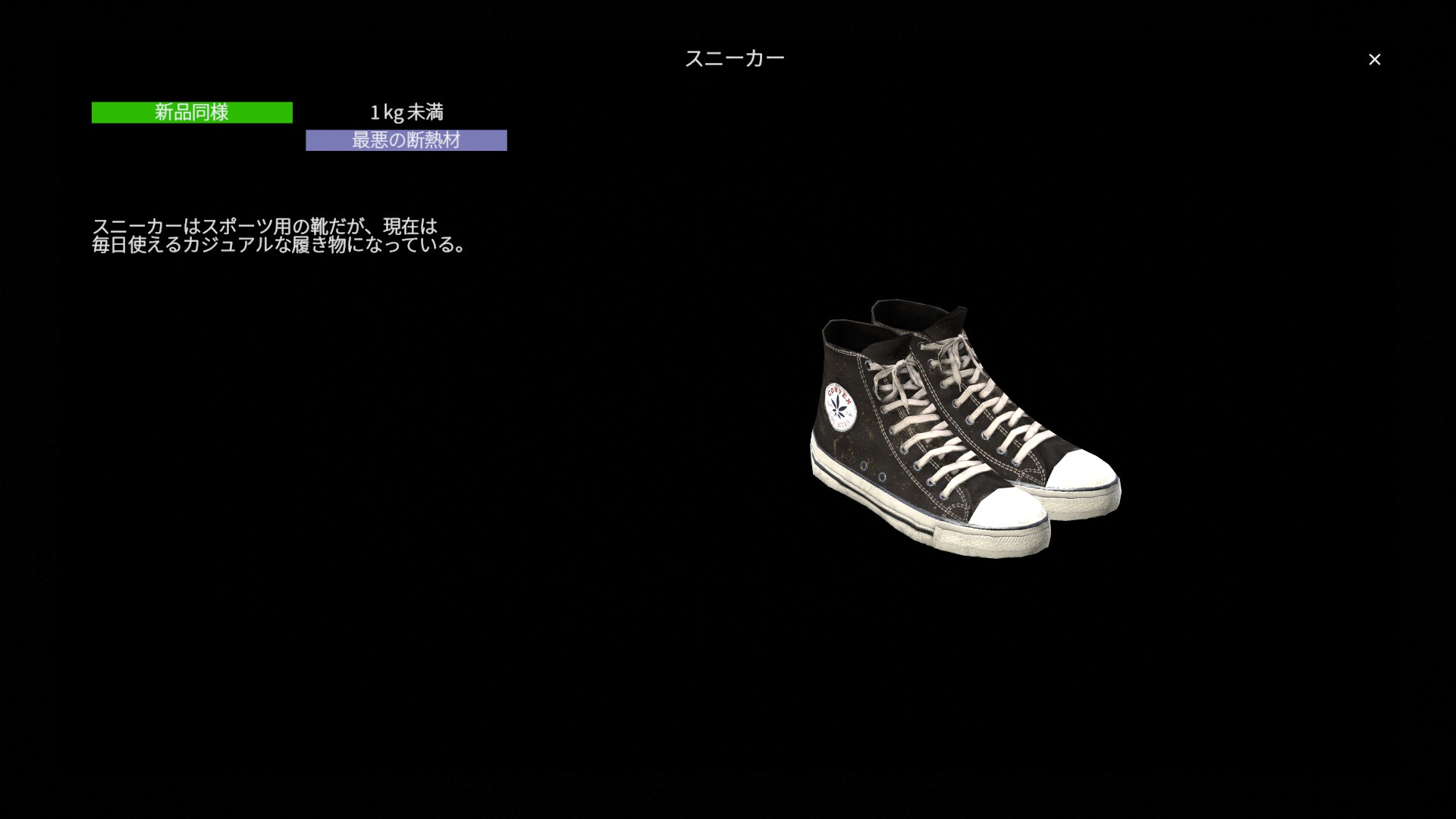総じてスニーカーは 見た目のカジュアルさに対して性能面は控えめな靴 です。環境耐性や防御性能は低く用途を選ぶ装備であり、見た目を重視して選ばれることも多い装備です。