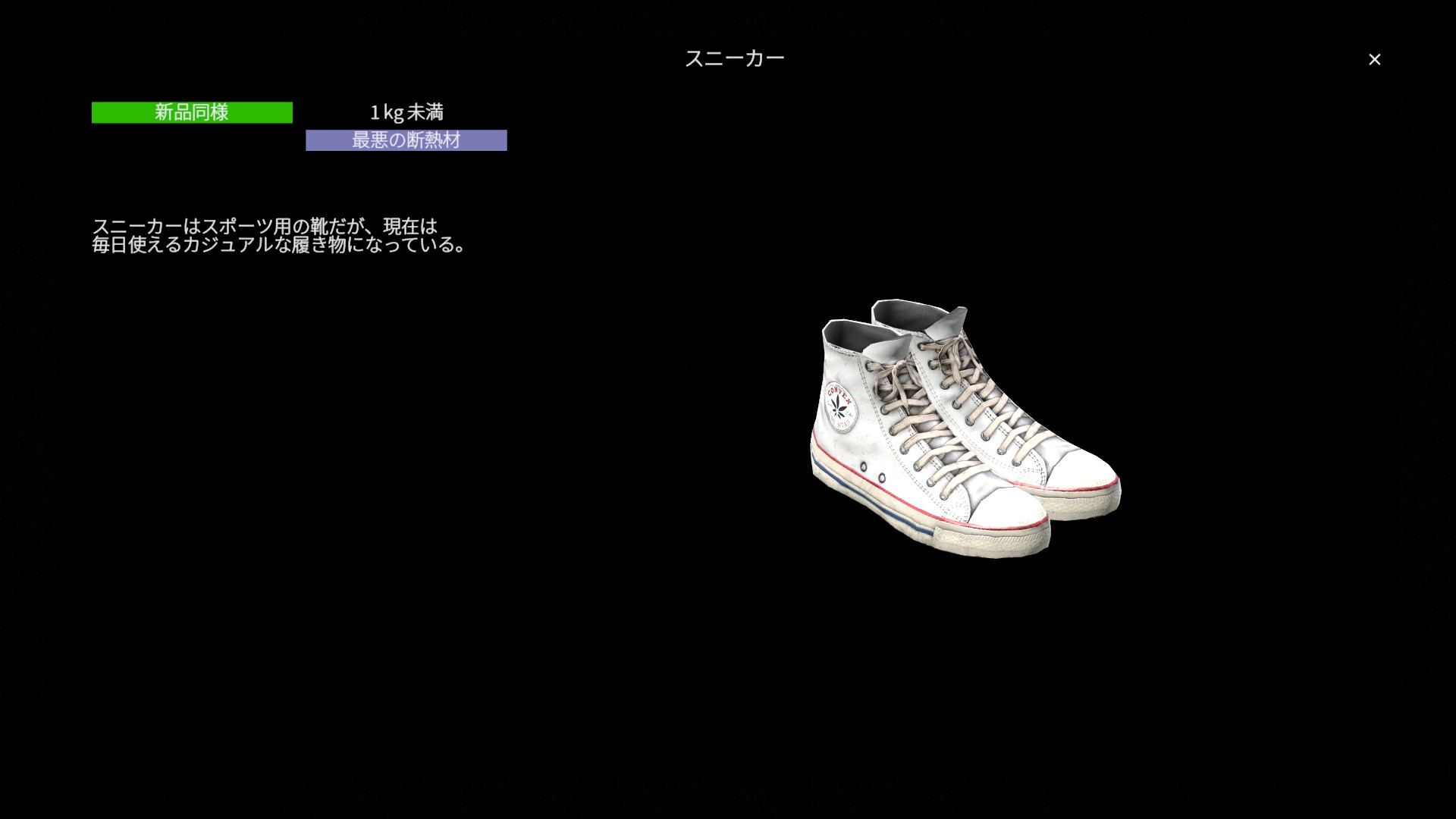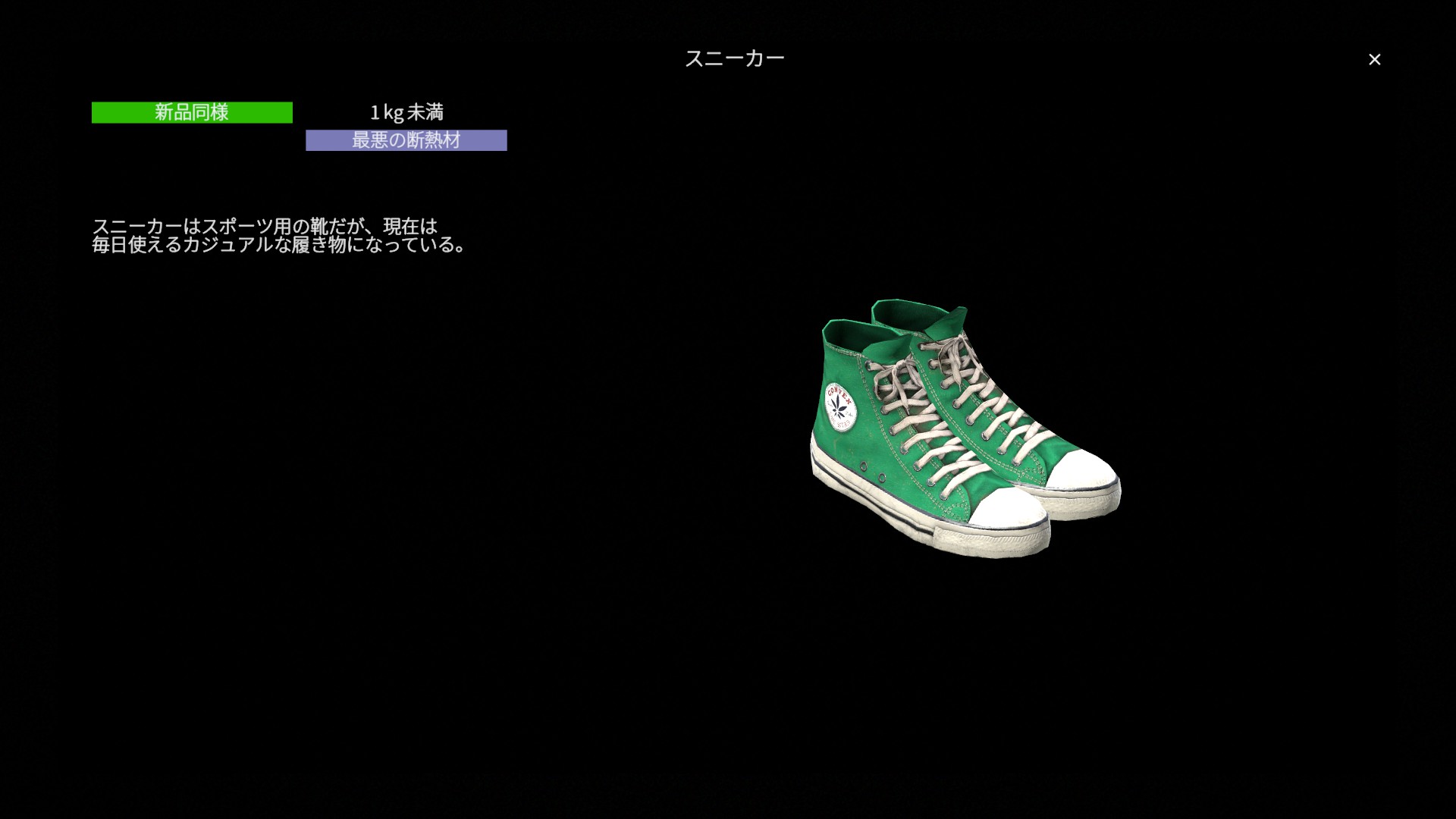 | Green | 780g | 8 (4×2) | 80 | ずぶ濡れ状態 (1.00) | 最悪の断熱材 (0.20) | 高い (0.90) | 静か | 革用の裁縫セット |
