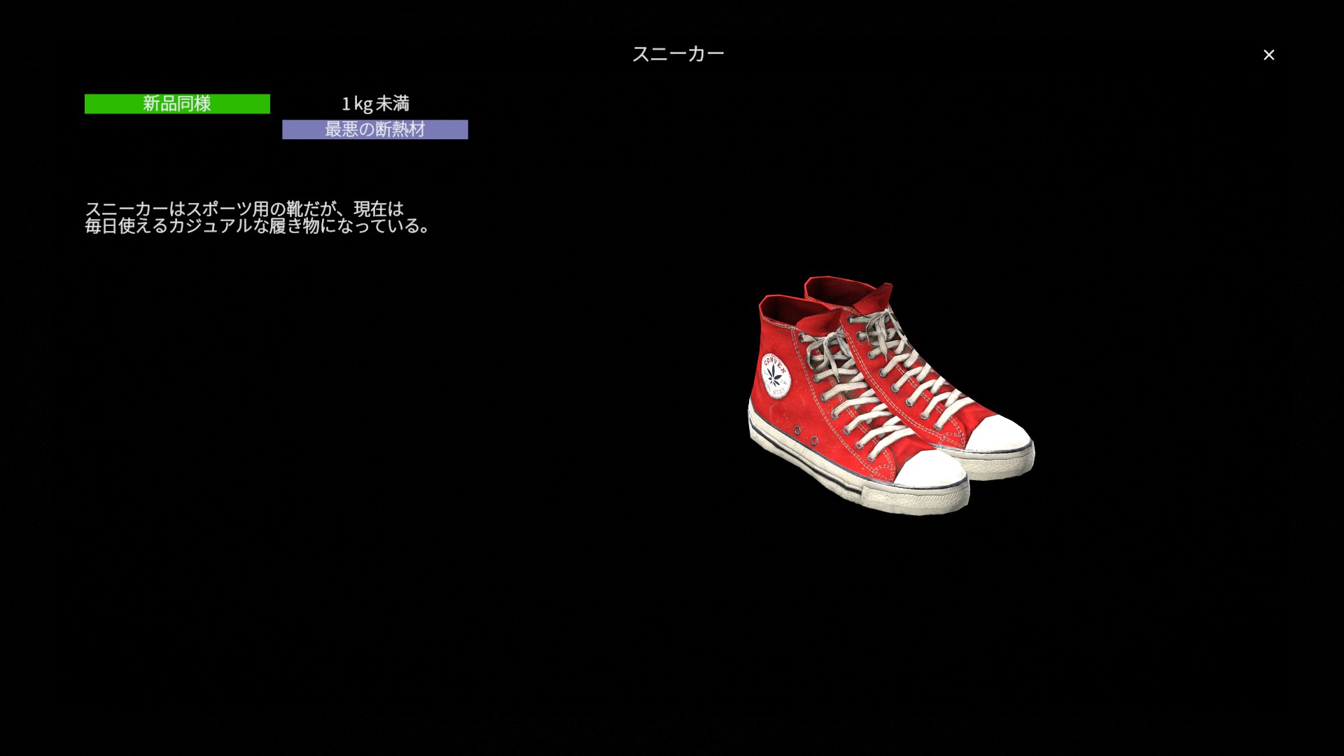 | Red | 780g | 8 (4×2) | 80 | ずぶ濡れ状態 (1.00) | 最悪の断熱材 (0.20) | 高い (0.90) | 静か | 革用の裁縫セット |