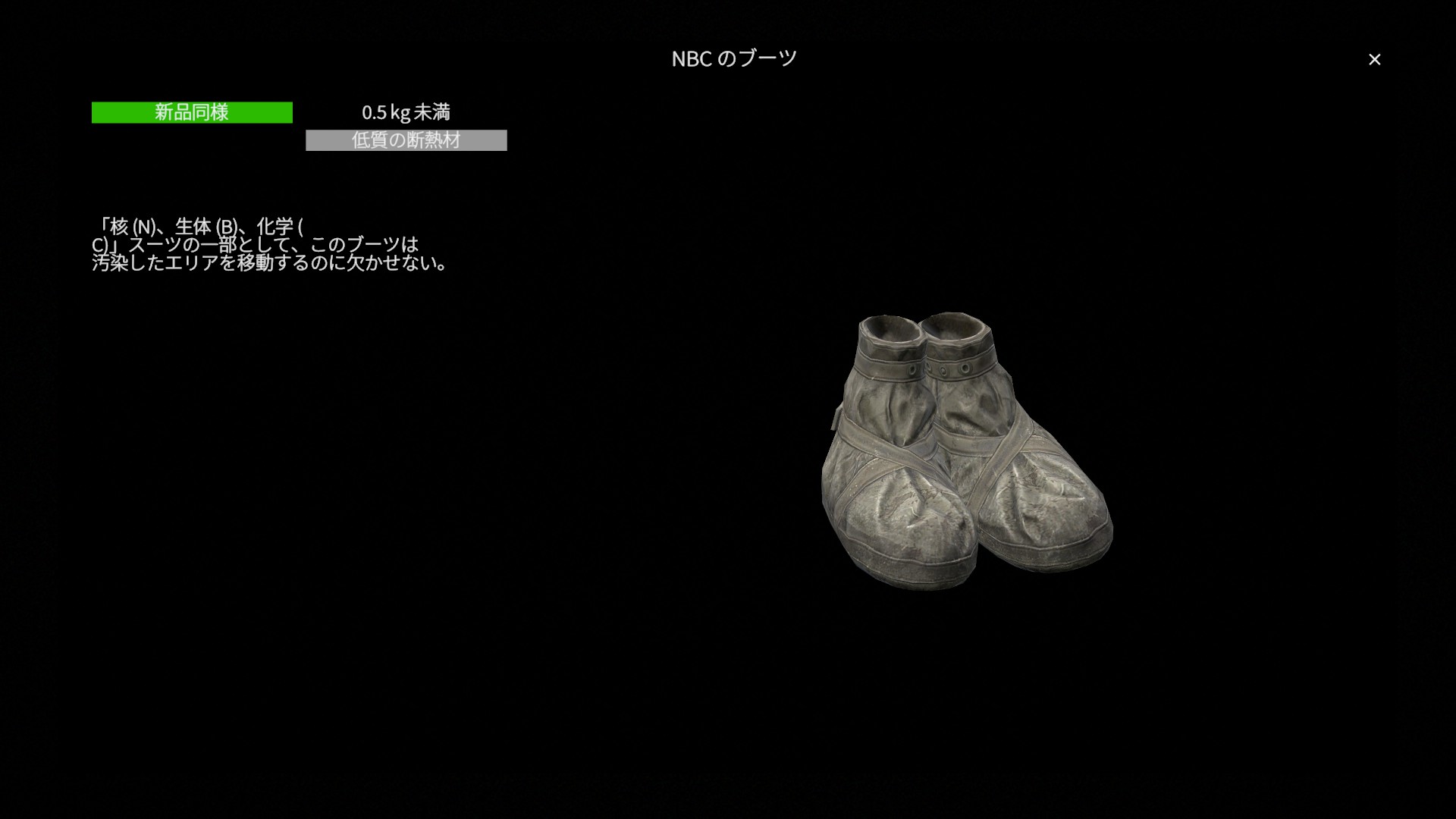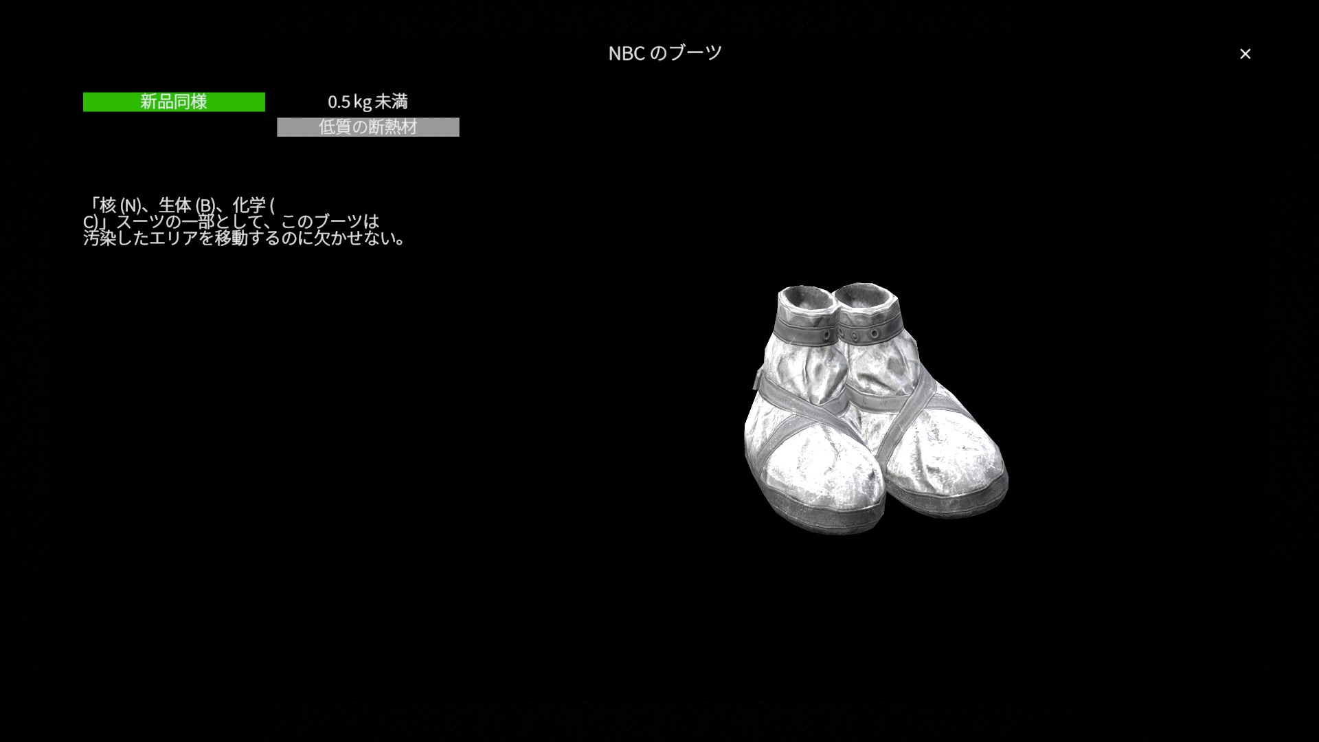 「核(N)、生体(B)、化学(C)」スーツの一部として、このブーツは汚染したエリアを移動するのに欠かせない。