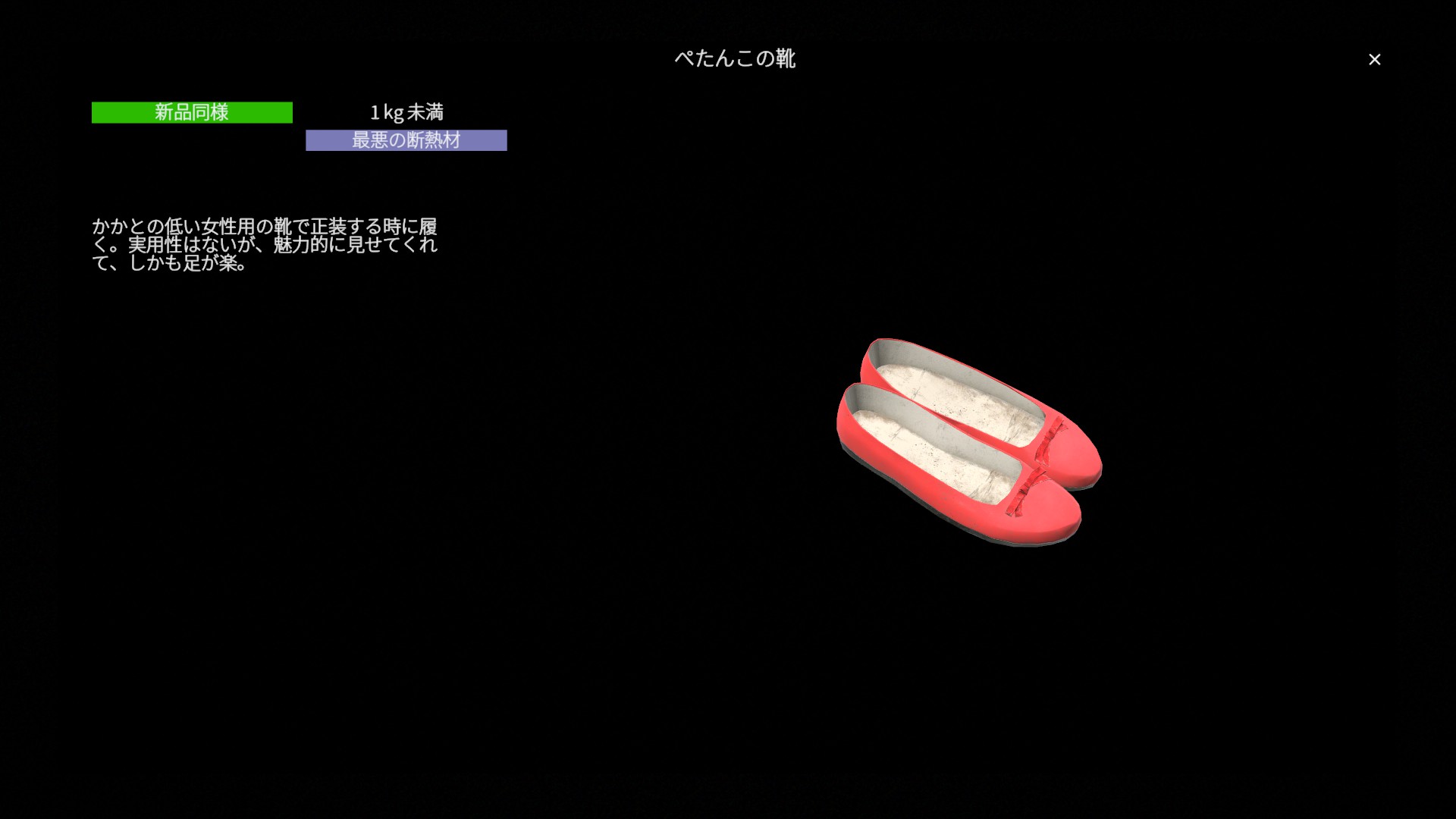 総じてぺたんこの靴は 見た目を重視した軽装向けの靴 です。環境耐性や防御性能は低く用途を選ぶ装備であり、見た目を重視して選ばれることも多い装備です。
