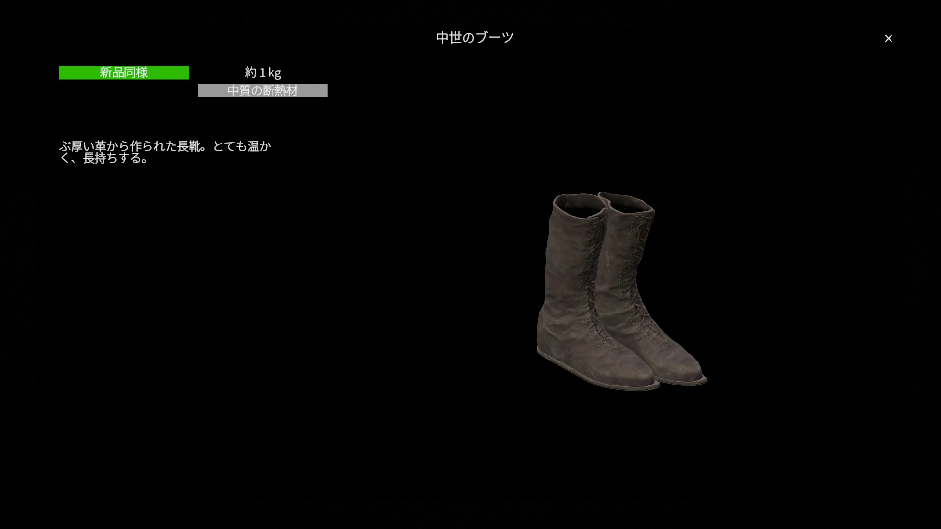 長靴型の構造となっており、シンプルな革製のブーツとなっています。他の 中世シリーズの装備 と組み合わせることで、雰囲気を高めることができます。