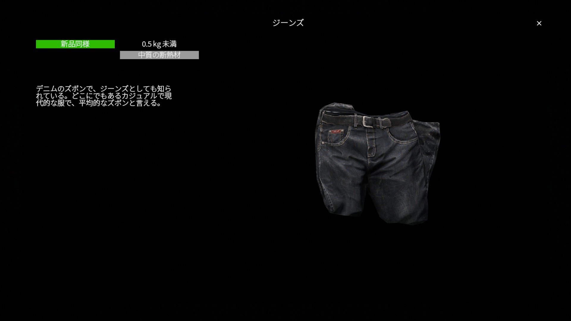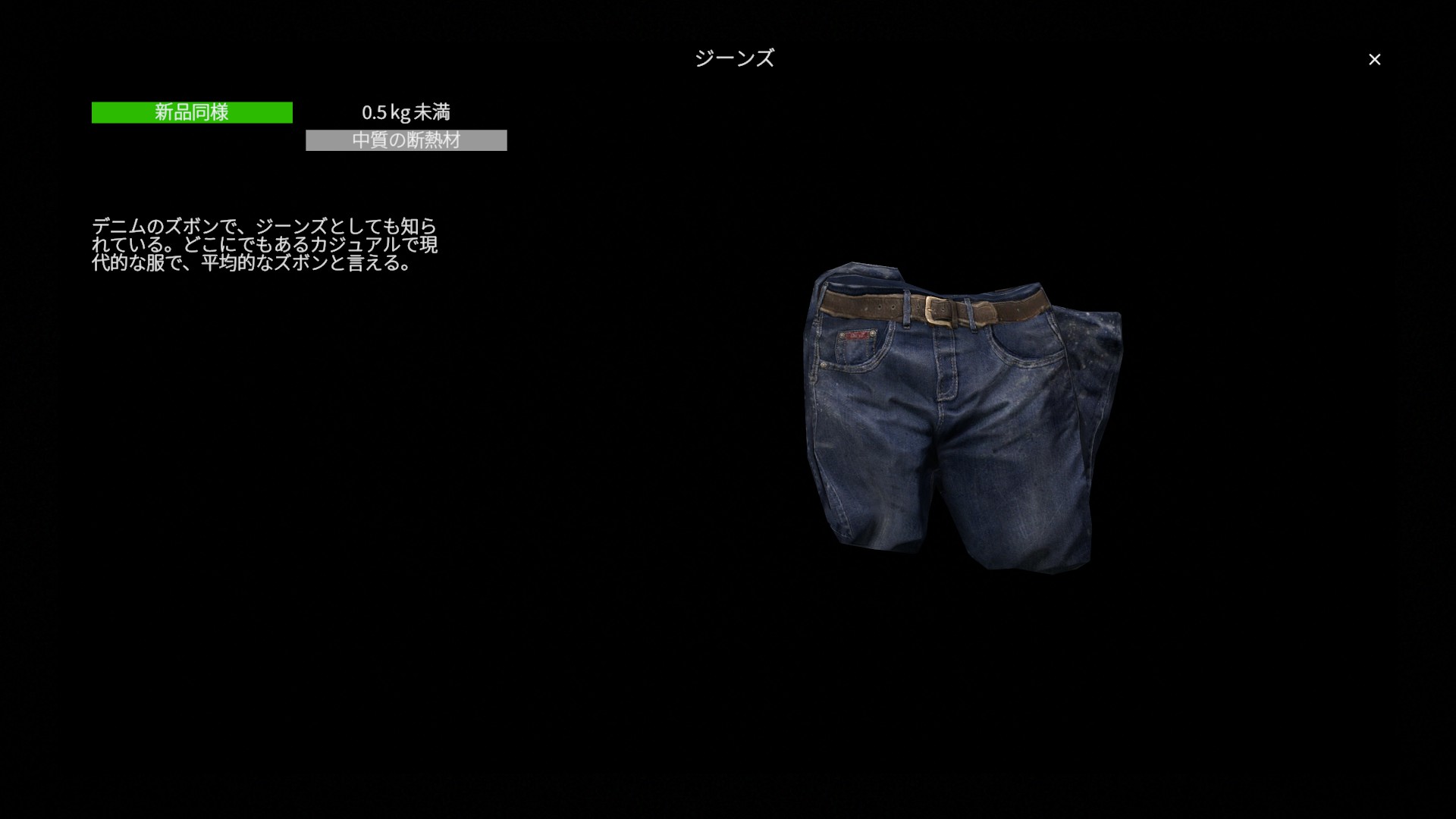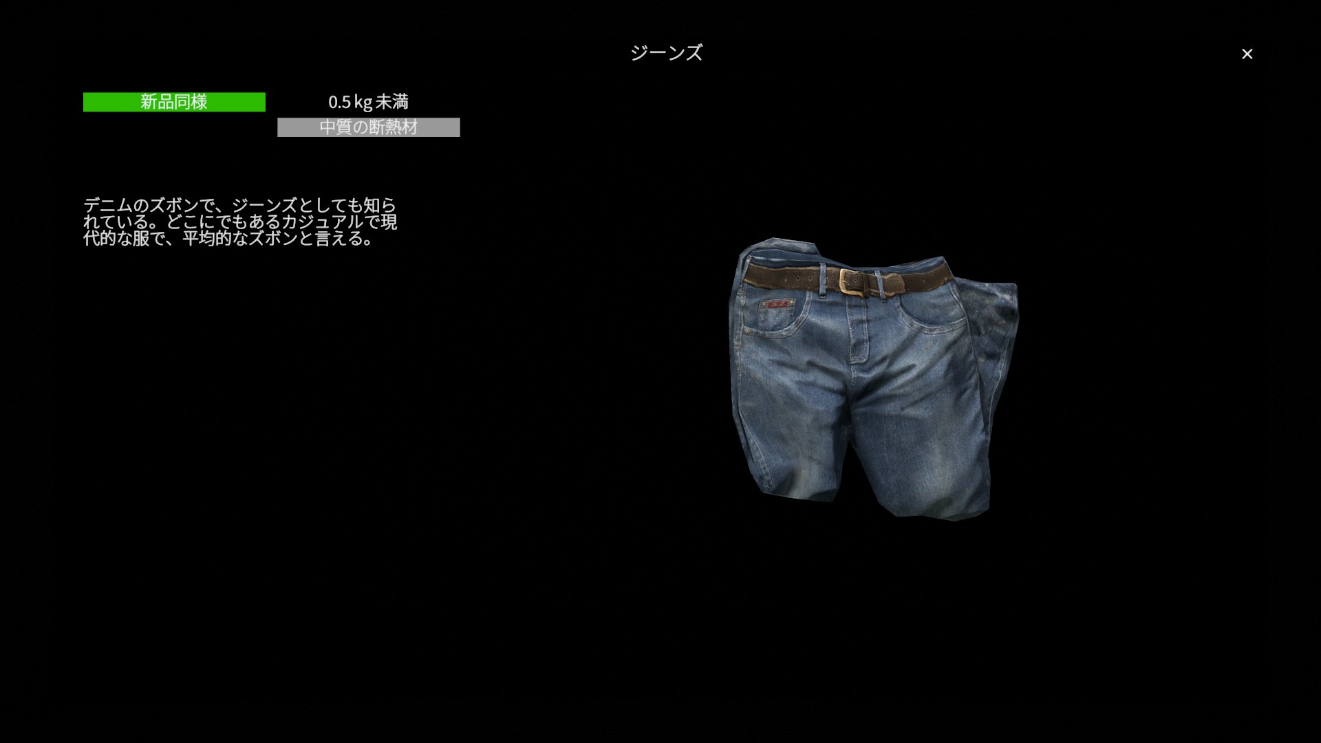 総じてジーンズは 軽量で扱いやすくバランスの取れたズボンであり、序盤から中盤にかけて安定して使用できる装備 と言えるでしょう。